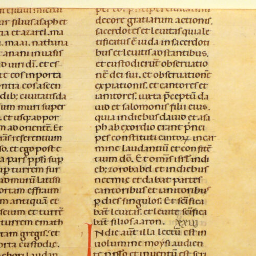 1rA-1vB Biblia sacra. Vetus Testamentum. Nehemias 12, 34 – 13, 17 inc. Mathanie filius Michai[.] filius Zecchur exp. ling[…] populi et populi et obiurgavi e-...