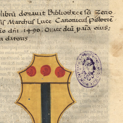 Esemplare completo. L’esemplare presenta come fogli di guardia iniziali e finali frammenti membranacei da un codice del sec. XIV contenente l’Ars notaria di Rolandino Passaggieri....
