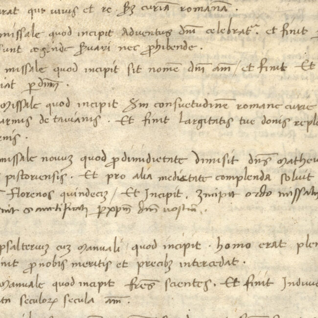 L’inventario, composto dal canonico Sozomeno per conto del vescovo Ubertino degli Albizi, elenca 102 voci per un totale di 125 volumi. Edizione: Giancarlo Savino, La...