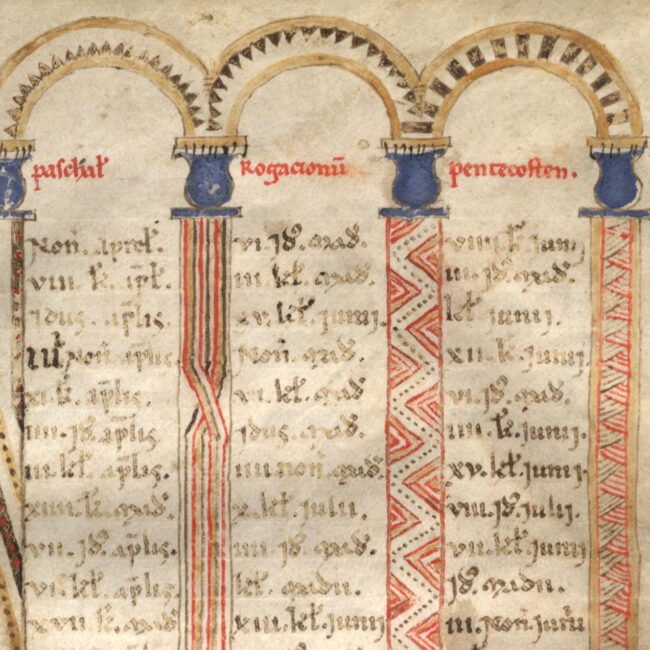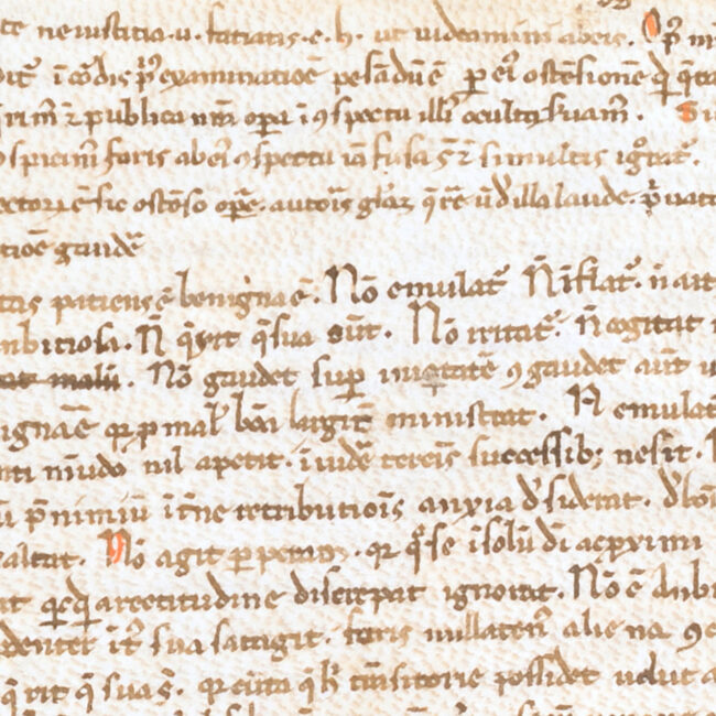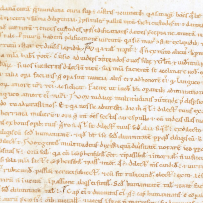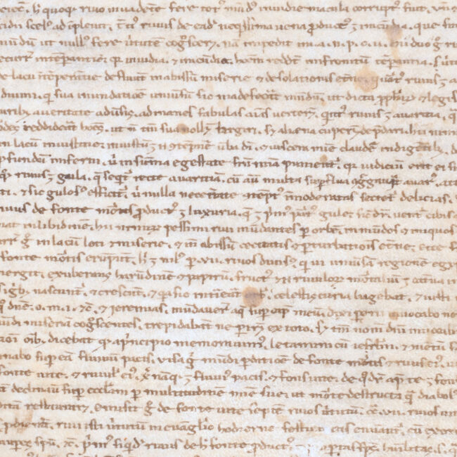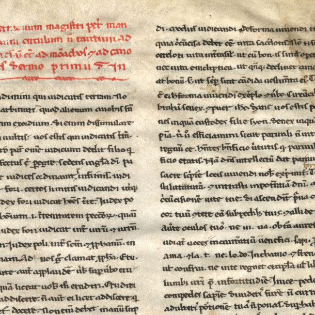Il foglio di guardia anteriore è un frammento di messale in carolina e onciale.