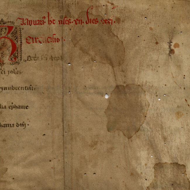 ff. 1r-6v, Kalendarium – obituarium Membr.; 6 fogli solidali appartenenti allo stesso fascicolo (restano i bifogli esterni di un originario fascicolo di 18 fogli); 393...
