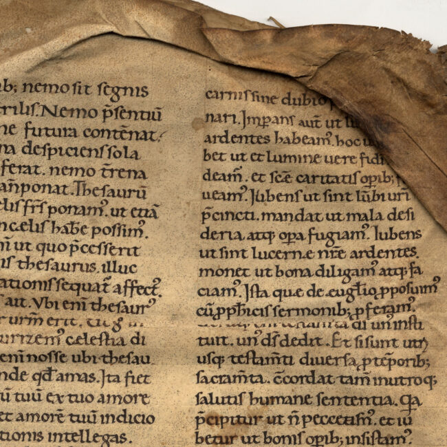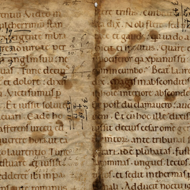 1rA-vB Acta sancti Laurentii, inc. ad beatum Laurentium: Video in te hominem; expl. vidue in agro Verano quarto [sotto, uno strappo] regnan- Membr.; 2 lacerti...