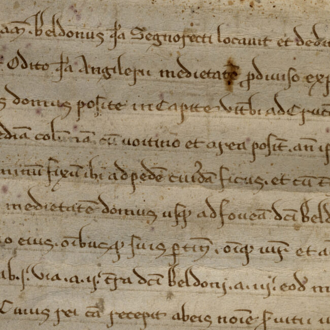 1225 febbraio 15, Pistoia. Beldono del fu Signoretto concede in affitto a Birello e Odito del fu Angilerio la metà di una casa con terreno...