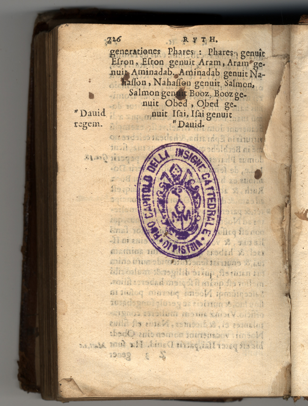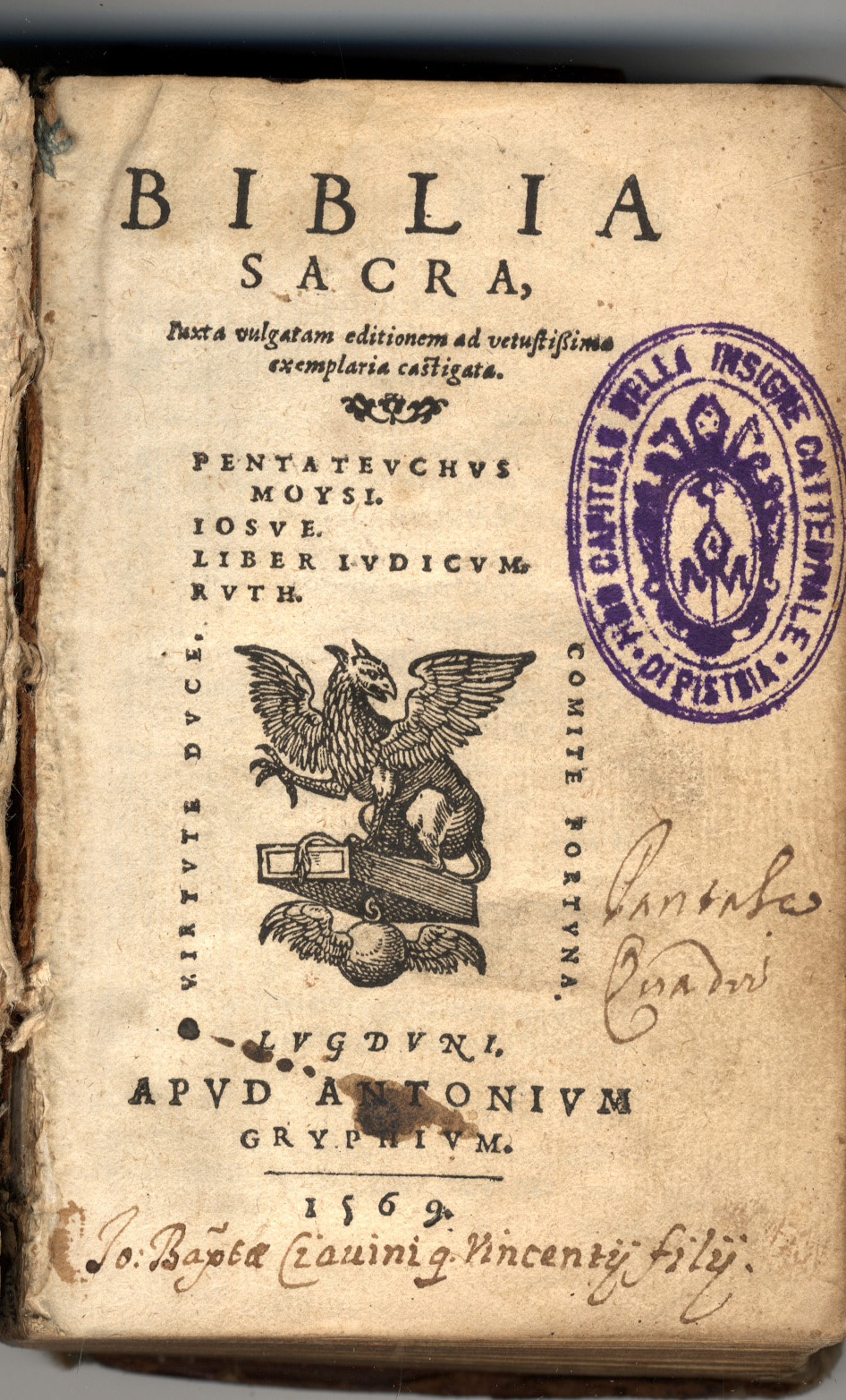 Sul contropiatto anteriore, di mano del sec. XVI nota parzialmente cancellata: “Hic liber est […] Tadei de […]”; a c. [1]r nota di possesso di mano del sec. XVII: “Pantaleo Quadri”; sotto di altra mano del sec. XVII: “Iohannes Baptista Ciavini quondam Vincentii filii”; nel contropiatto posteriore della stessa mano: “Iohannes Baptista quodam Vincentii filii de Casore Montis emit Pistorii 6 februari 1679”.