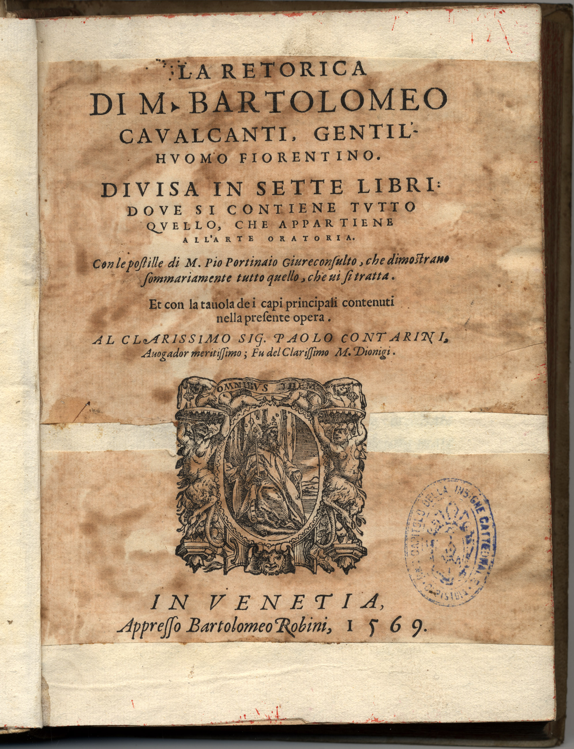 Esemplare completo. Il frontespizio, attualmente inccolato ad un foglio, è stato decurtato della parte superiore, della parte inferiore e di una sezione della parte centrale per eliminare probabili indicazioni di possesso.
