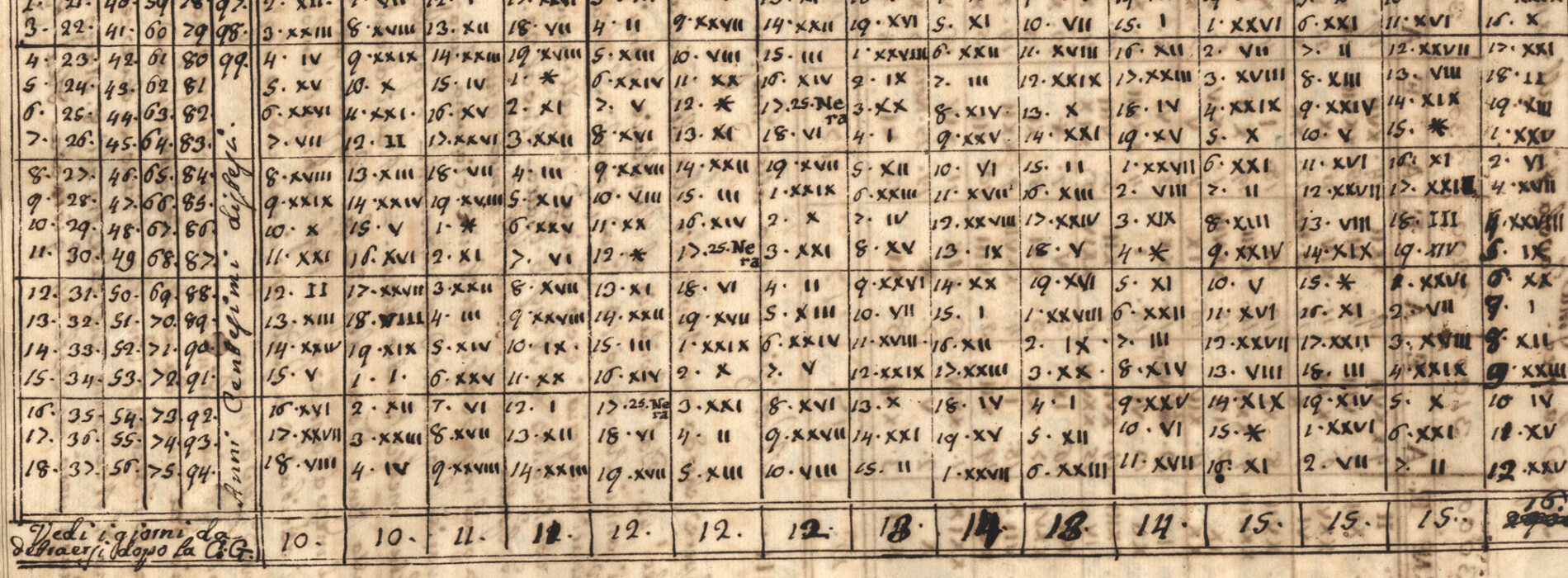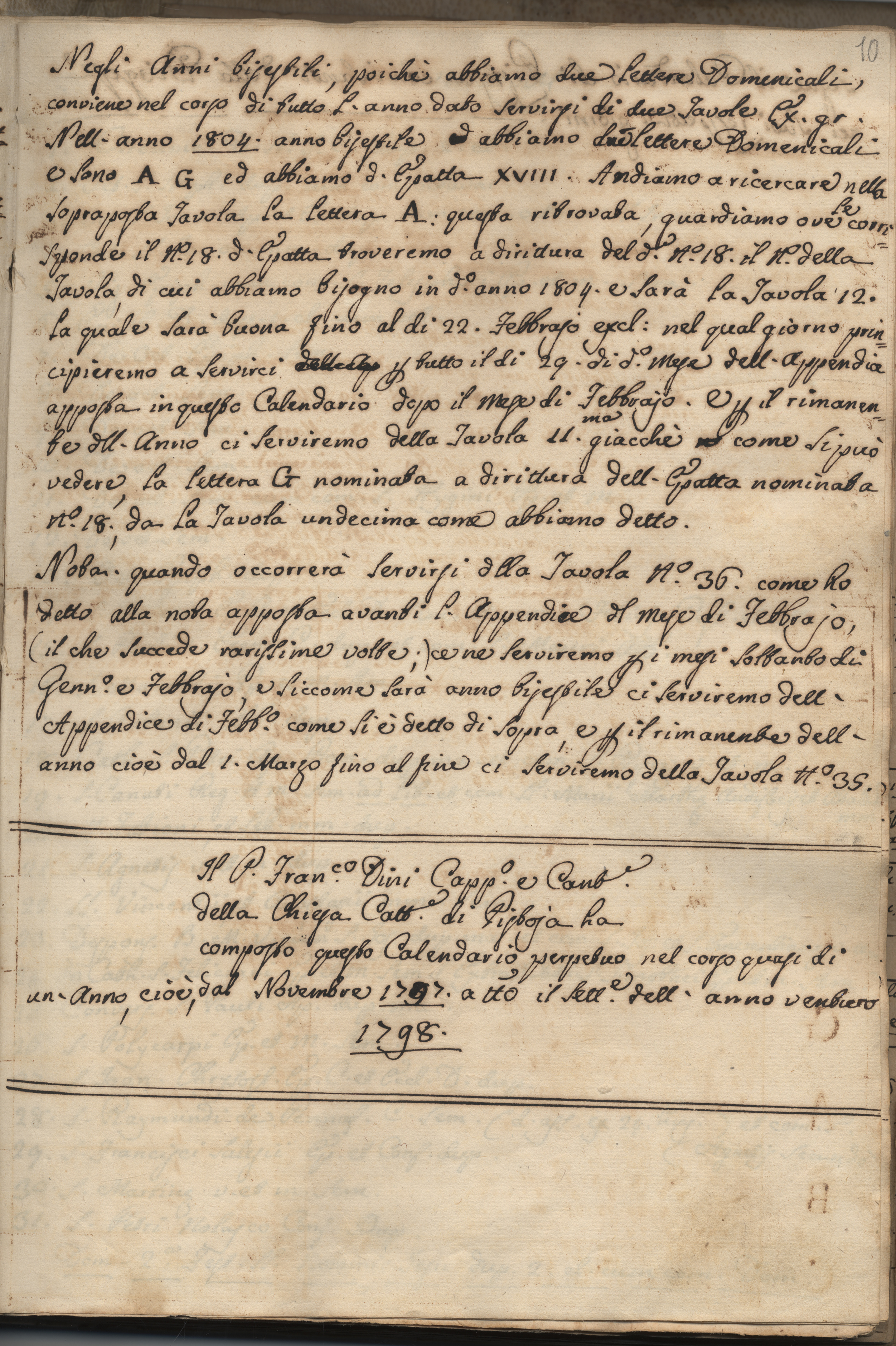 Al f. 10r sottoscrizione: Il padre Francesco Dini cappellano e cantore della Chiesa Cattedrale di Pistoia ha composto questo calendario perpetuo nel corso quasi di un anno cioè da novembre 1798 a tutto il settembre dell’anno 1798.