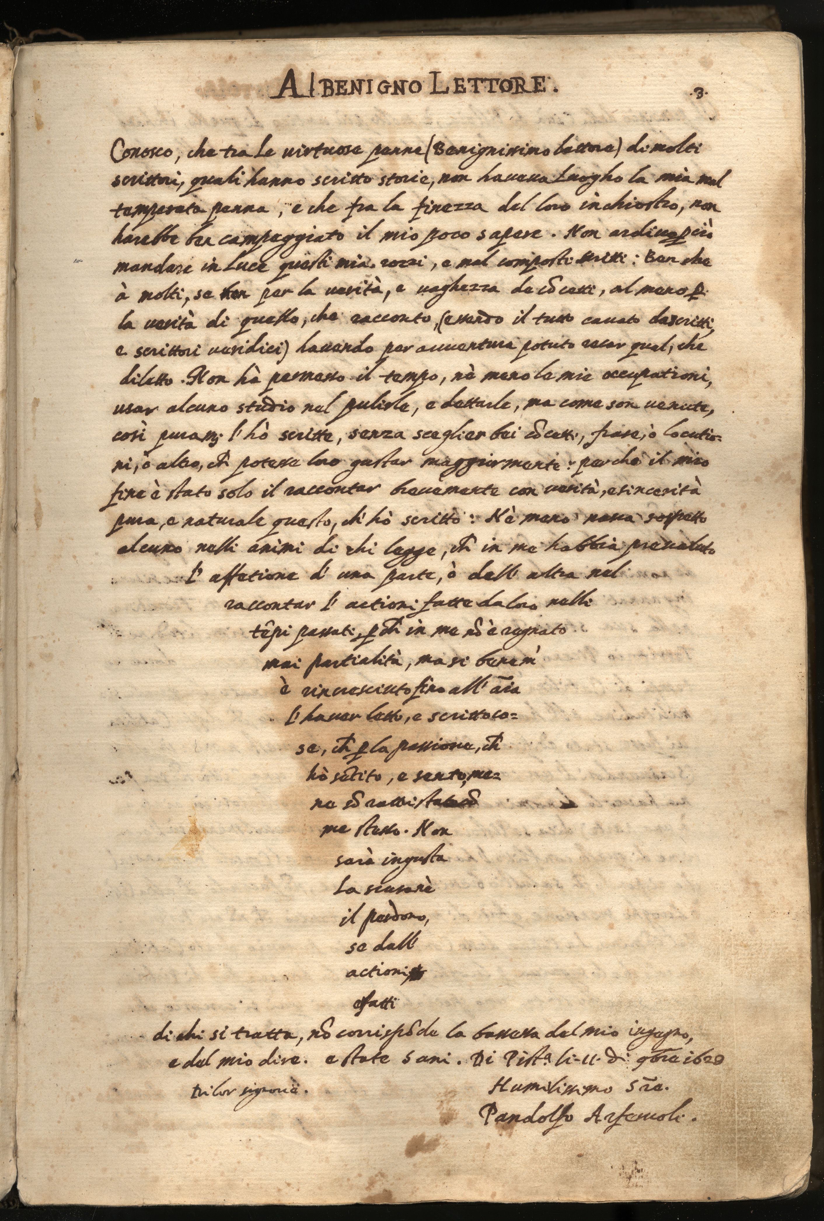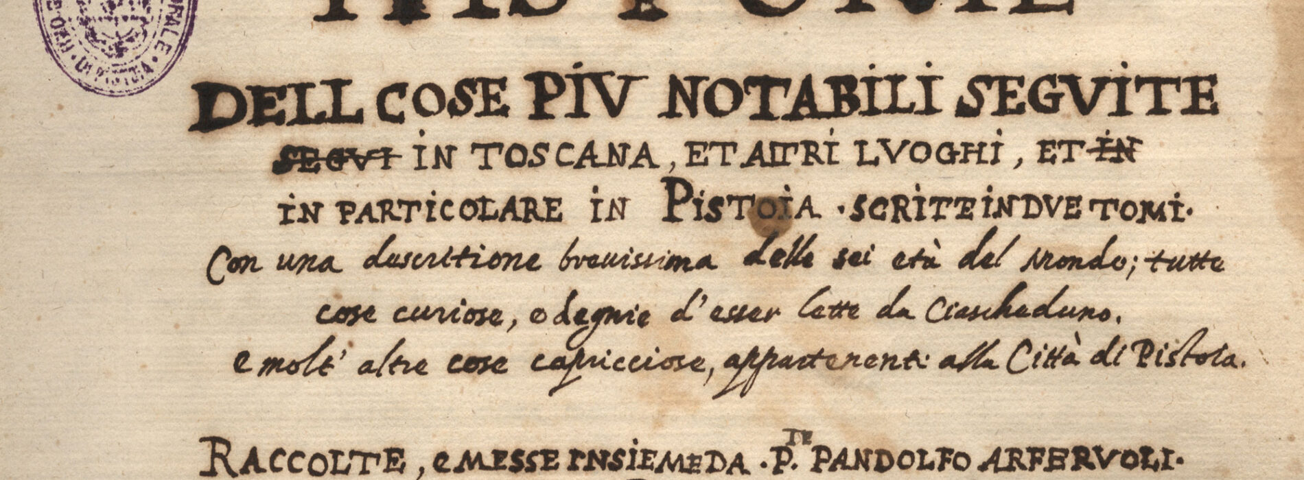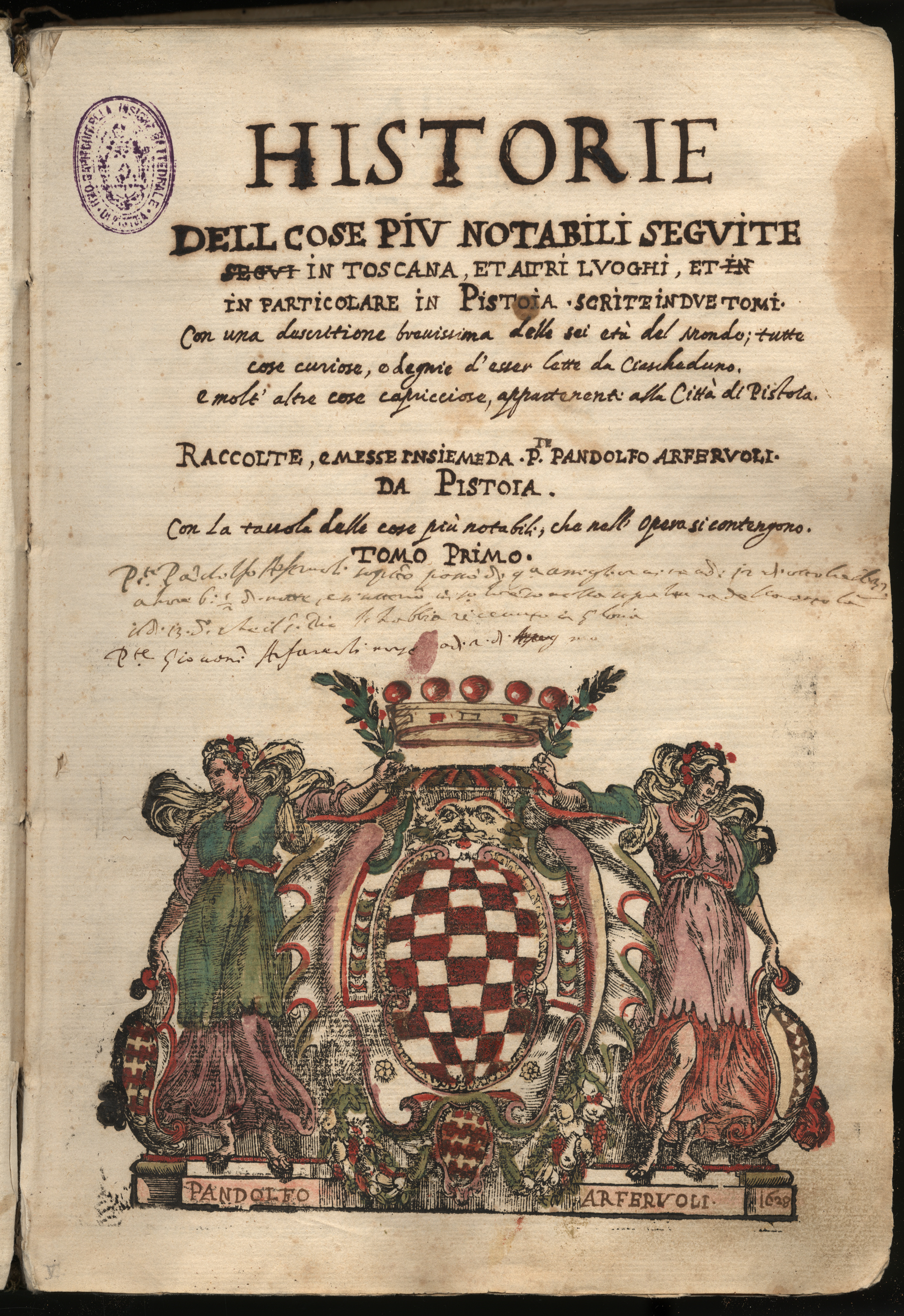 A p. V: Historie delle cose più notabili seguite in Toscana et altri luoghi et particolare in Pistoia scritte in due tomi con una descrittione brevissima delle sei età del mondo tutte cose curiose o degne d’esser lette da ciascheduno e molte altre cose capricciose appartenenti alla città di Pistoia. Tomo primo.