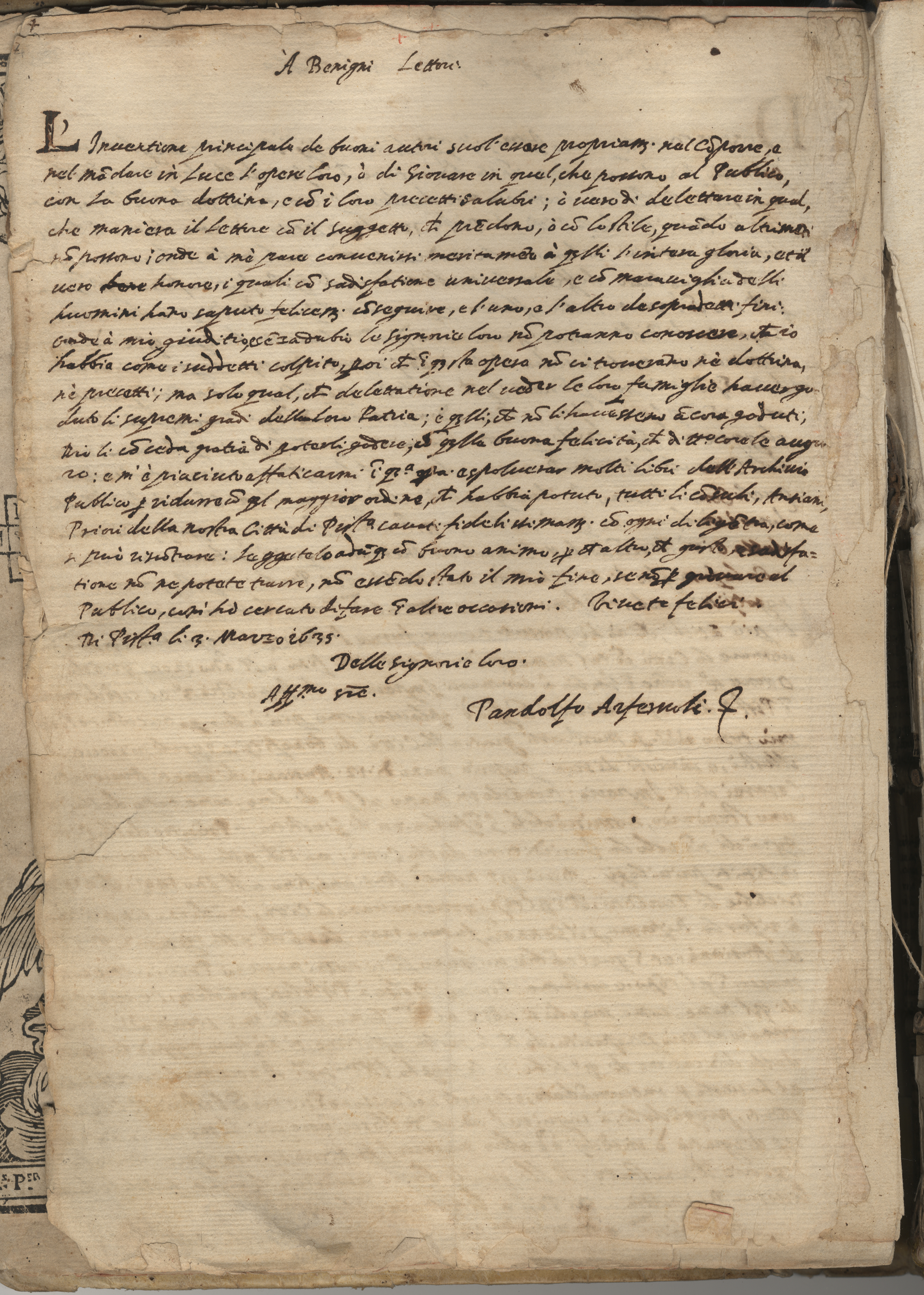 A p. III nota di Girolamo Arferuoli che ricorda la morte di Pandolfo avvenuta il 12 ottobre 1637. A p. Ir di mano del sec. XVIII annotazione storica su esponenti della famiglia Arfaruoli nel XIII sec.
