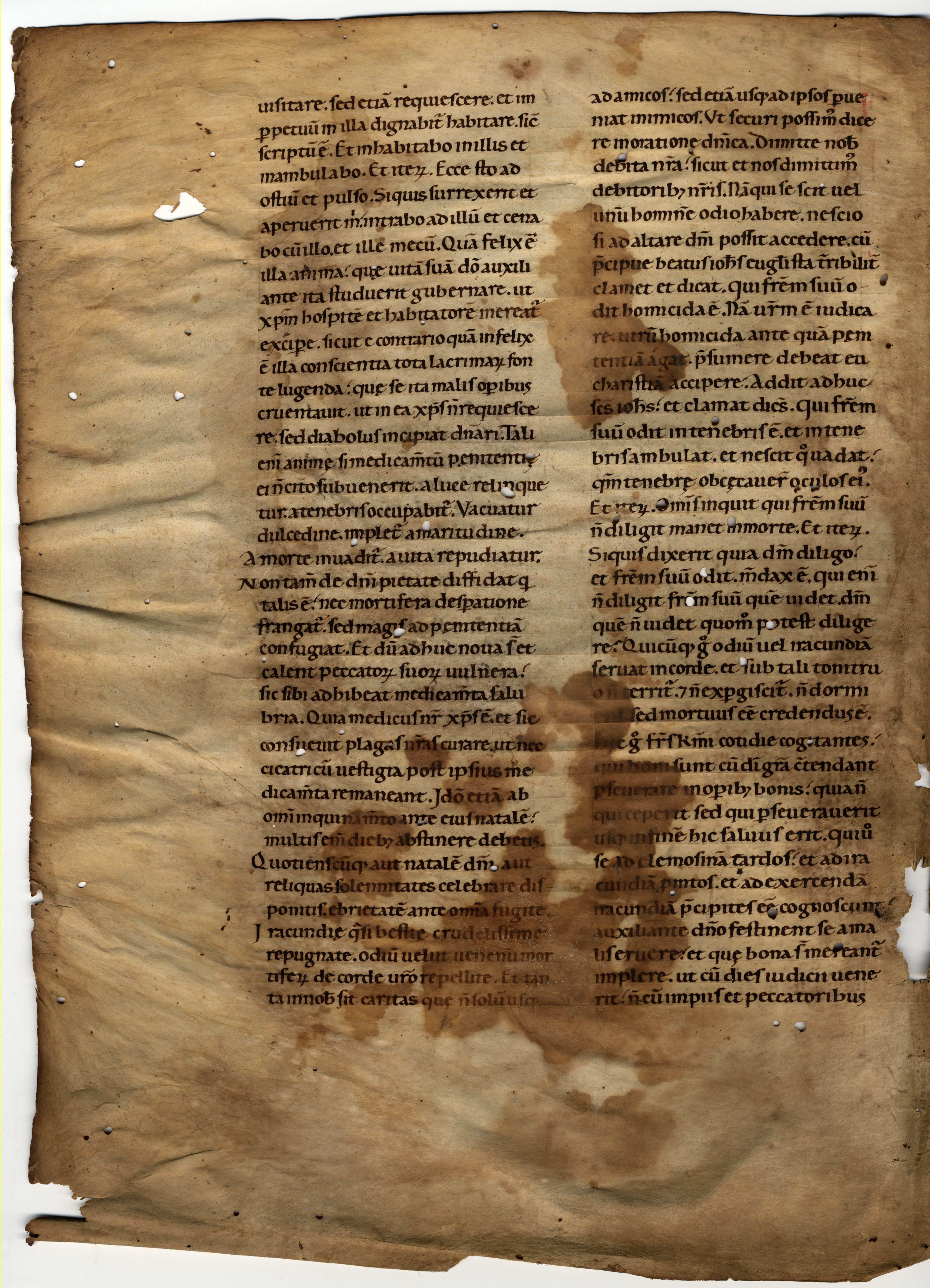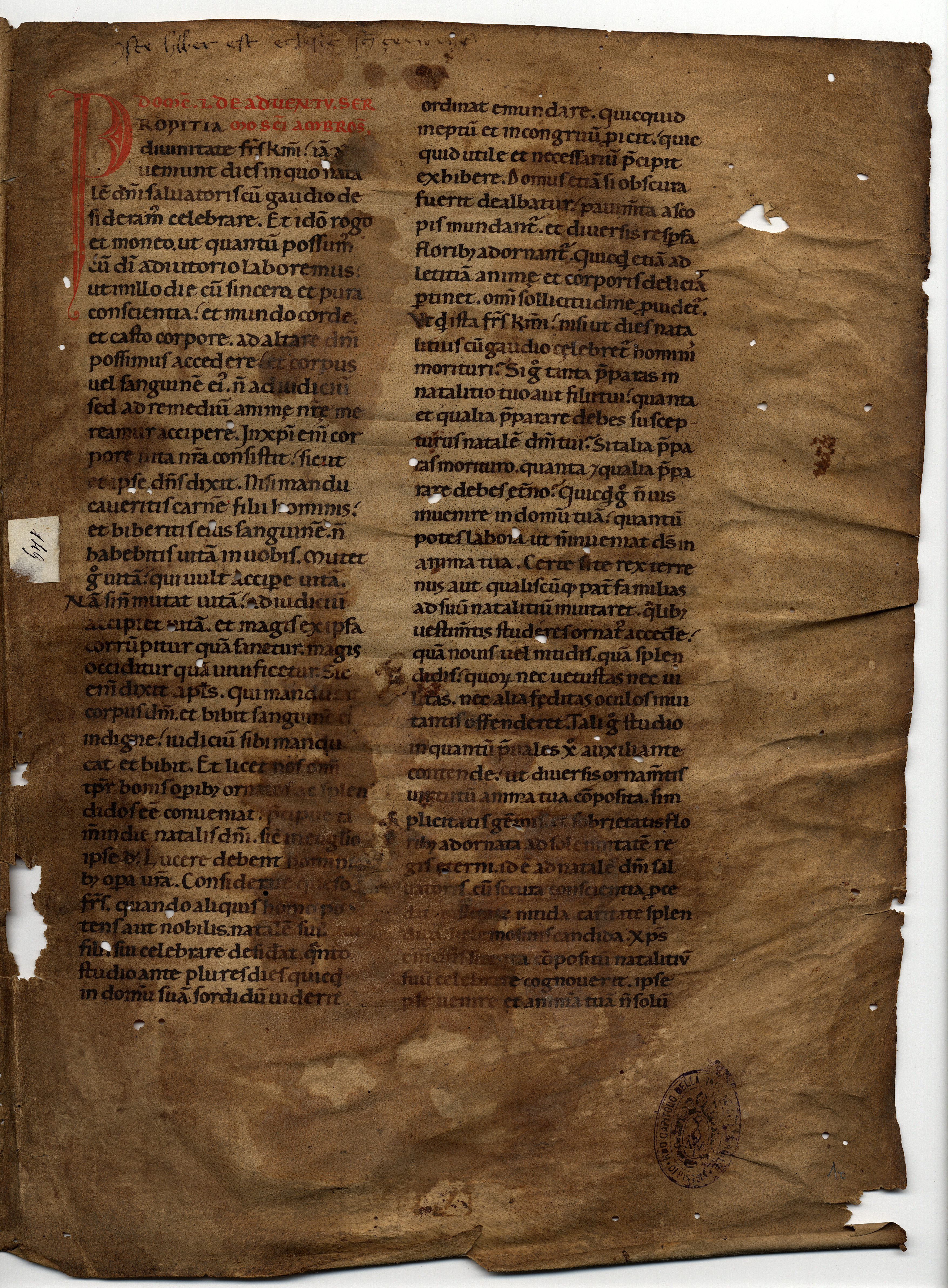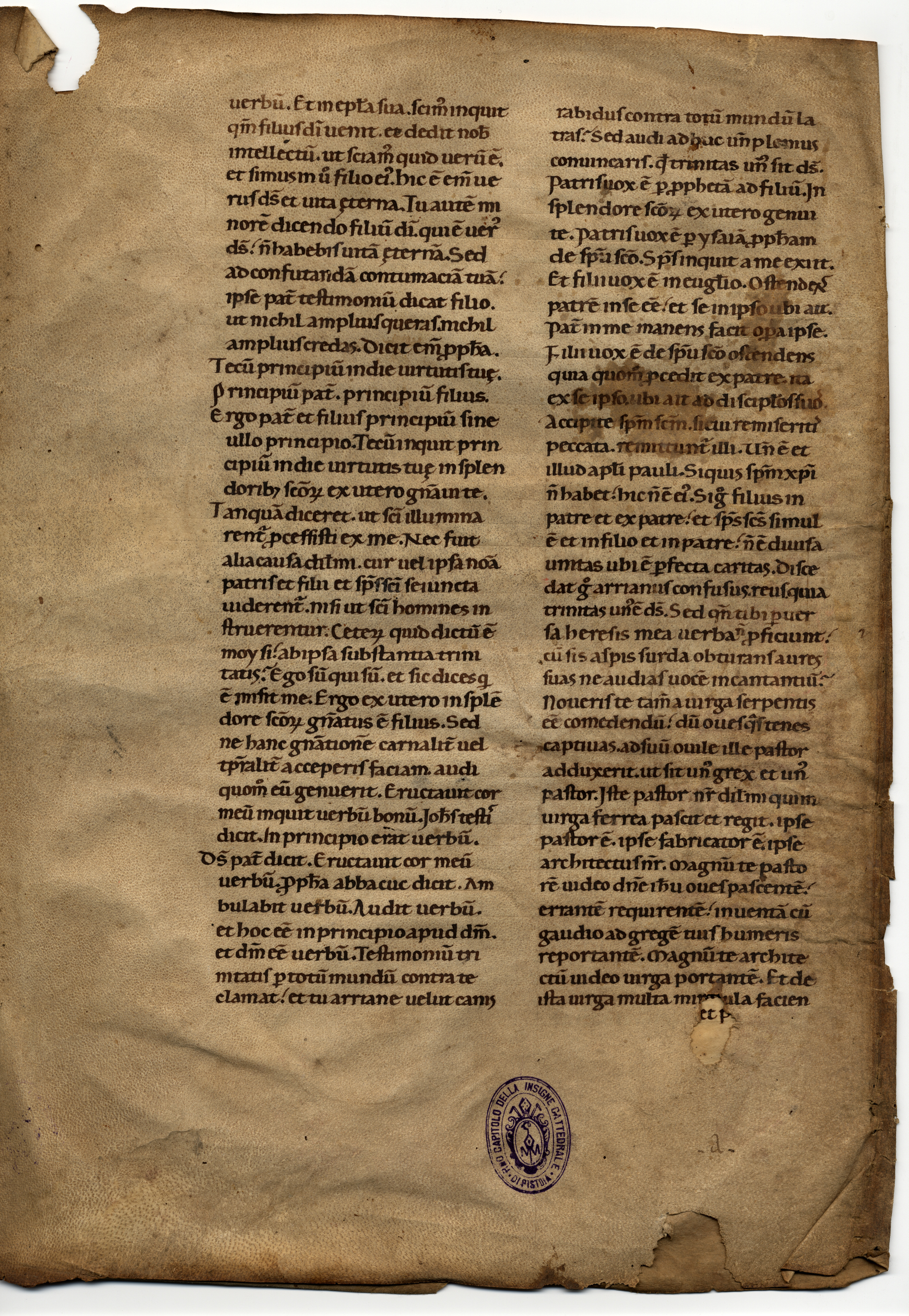 Si tratta del bifoglio esterno del primo fascicolo dell’Omiliario conservato, in modo frammentario, sotto la segnatura PT AC, C.163; l’incipit del frammento potrebbe identificare questo Omiliario con quello descritto nell’inventario del 1372: Unum sermonale quod incipit Propicia divinitate et finit Martir o, più probabilmente, non escludendo anche la possibilità che si descriva la stesso codice, pur con un’indicazione di explicit diverso, nell’inventario del 1432 di mano di Sozomeno (PT AC, D.22, f. 29v): Unum sermonale propitia divinitate fratres karissimi et finit de tactu non potest dubitari de littera antiqua.