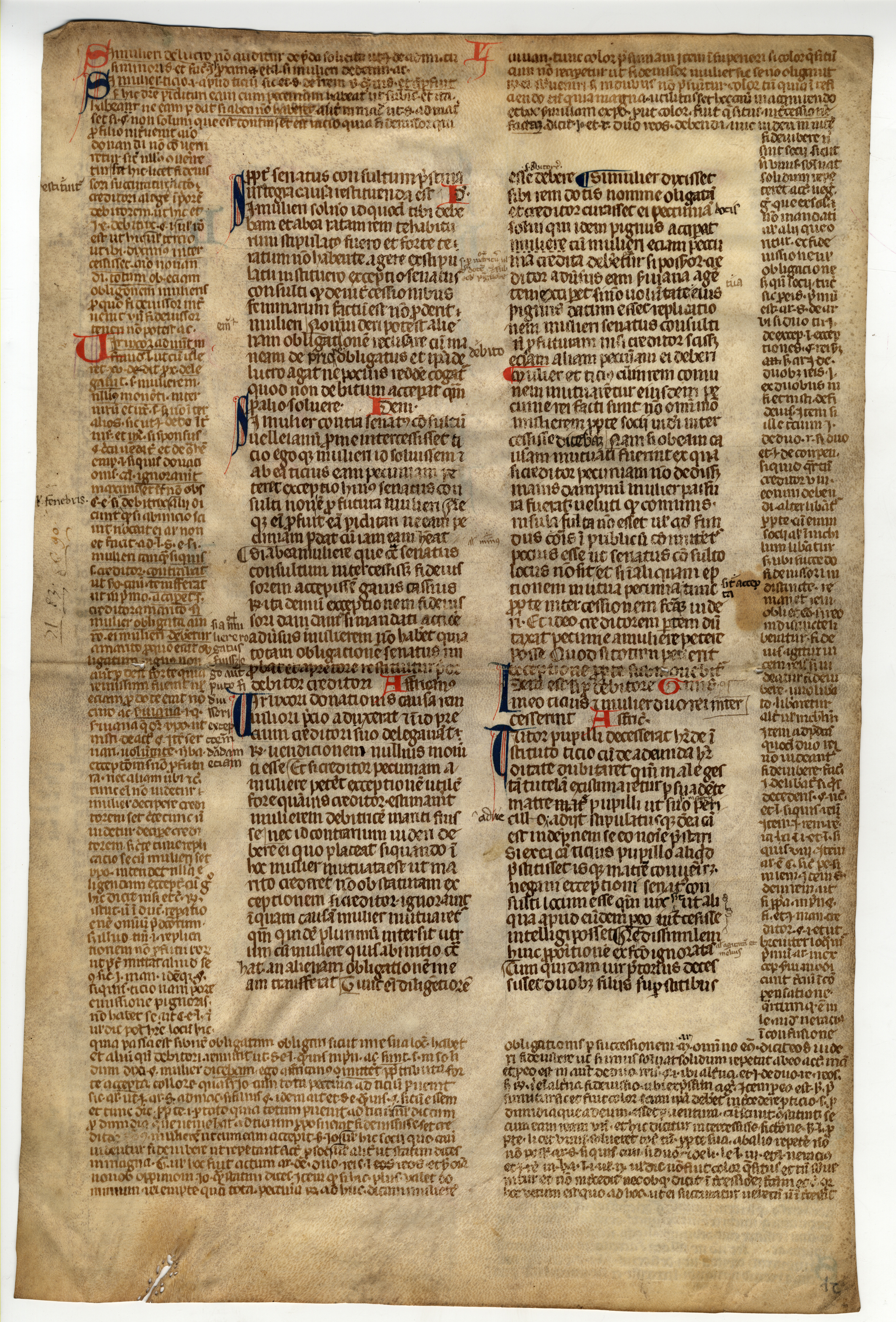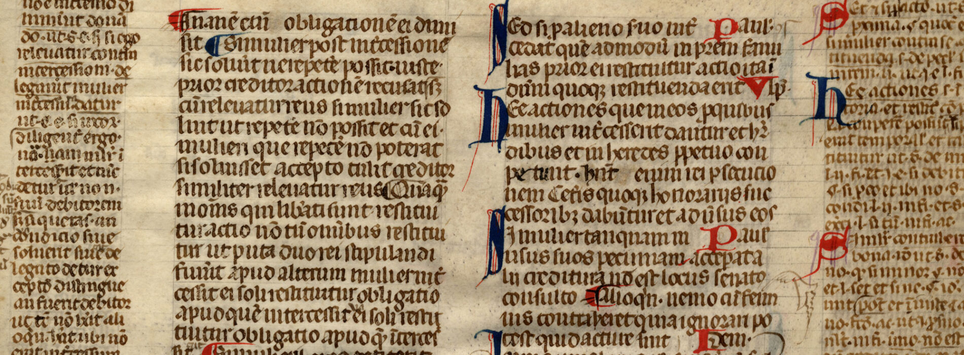 f. 1rA-vB, Giustiniano, Digesta cum glossa ordinaria, XVI, 1, 8, 9 – XVI, 1, , inc. inanem enim obligationem dimisit; expl. cum quidam vir praetorius decessisset duobus filiis superstitibus-
