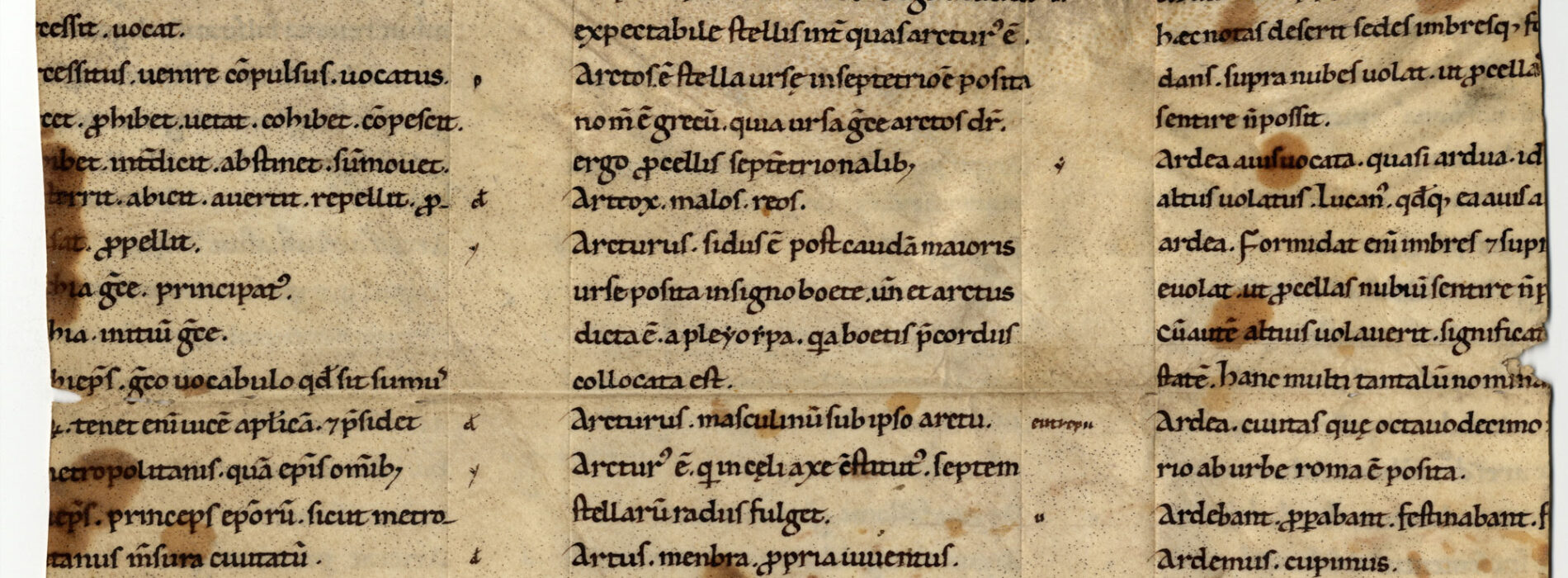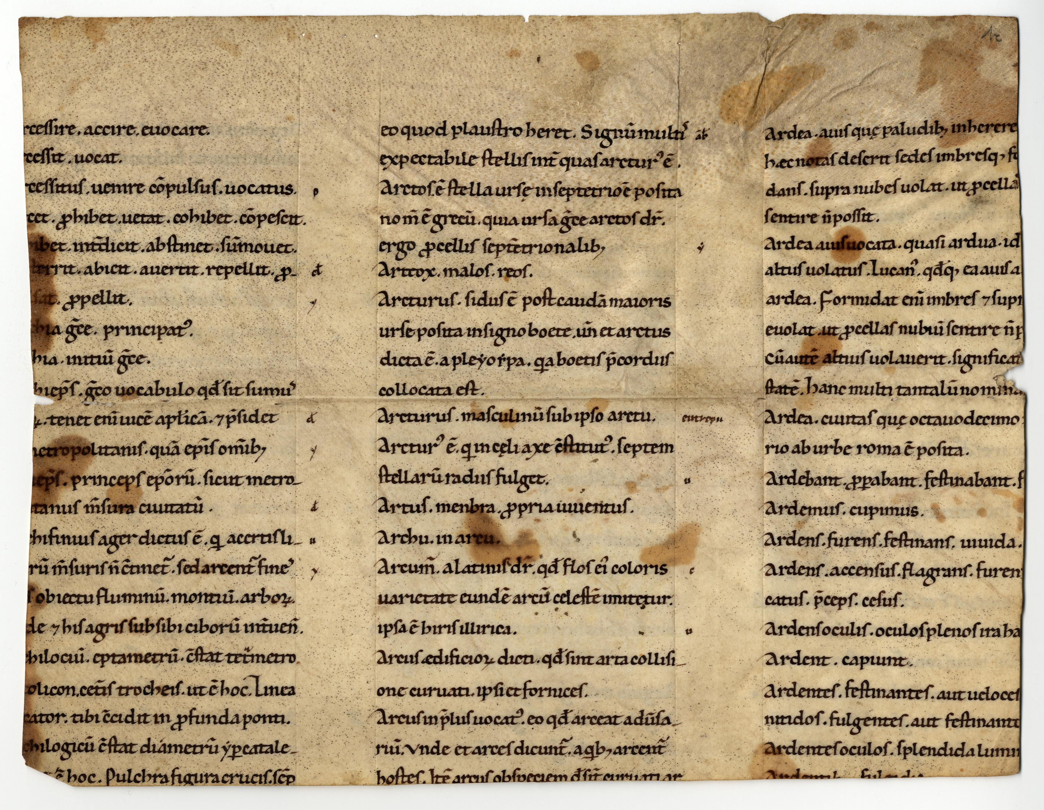 Con perdita del testo nei margini interno, esterno ed inferiore del foglio. Nell’intercolumnio sono annotate, della stessa mano, le fonti in forma di sigla (u = Virgilio; ab = Ambrogio; c = Cicerone; y = Isidoro)