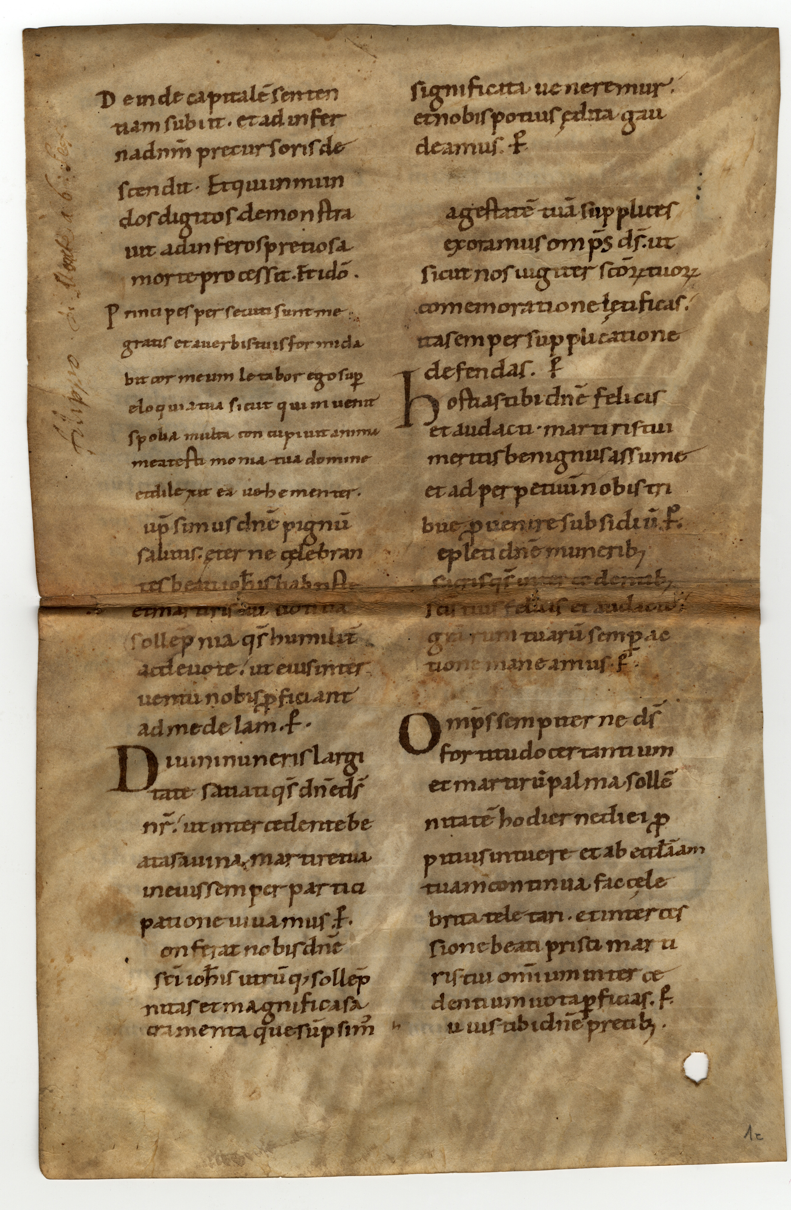 Membr.; 1 f.; 324 × 205 = 23 [262] 39 × 27 [60 (20) 62] 36, rr. 32 / ll. 32 (f. 1r); rigatura eseguita a secco con incisione dal lato pelo.