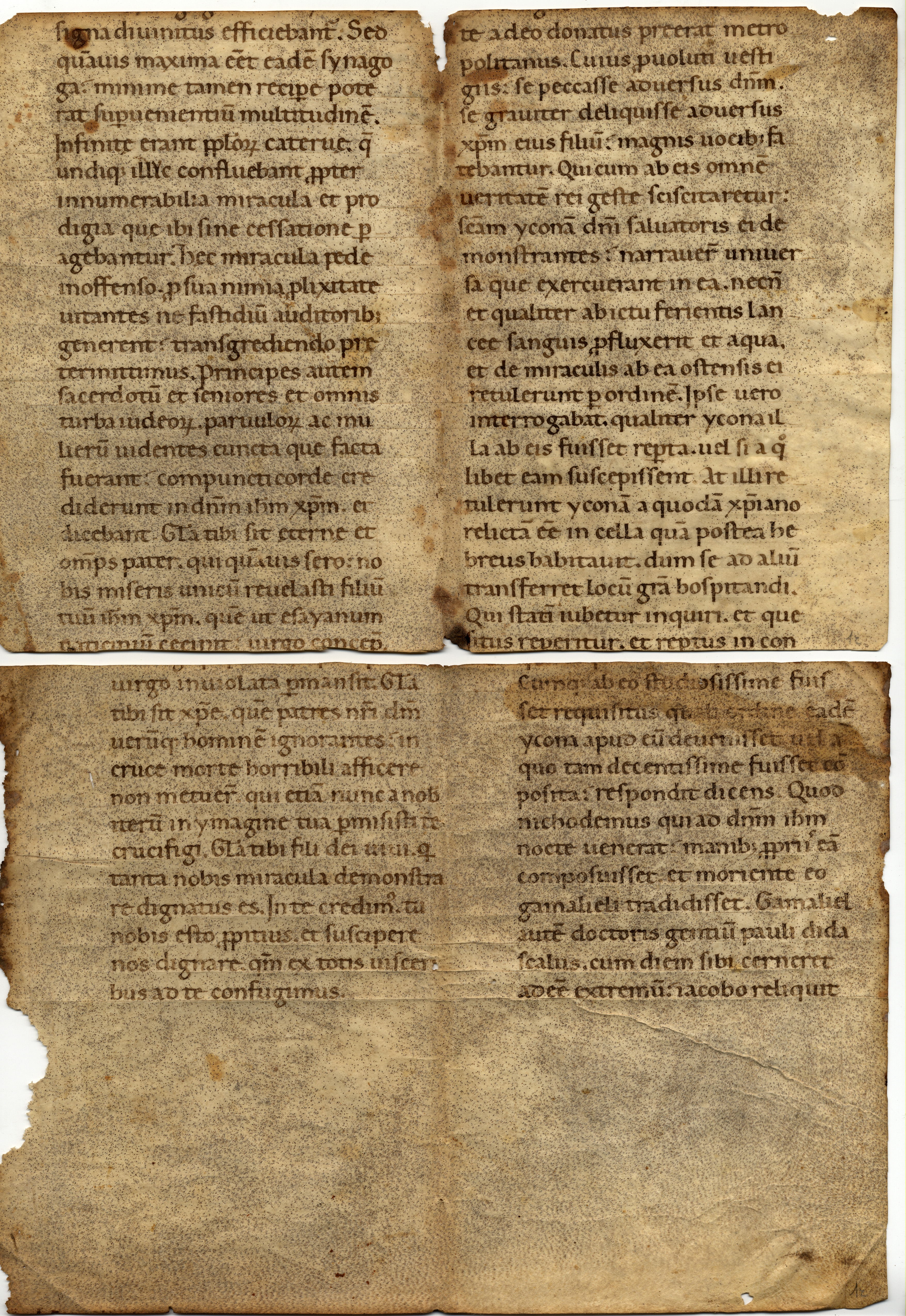 Le lacune testuali permettono di stabilire la caduta di una riga di testo tra i due lacerti e di circa sei righe di testo nel margine superiore del foglio.