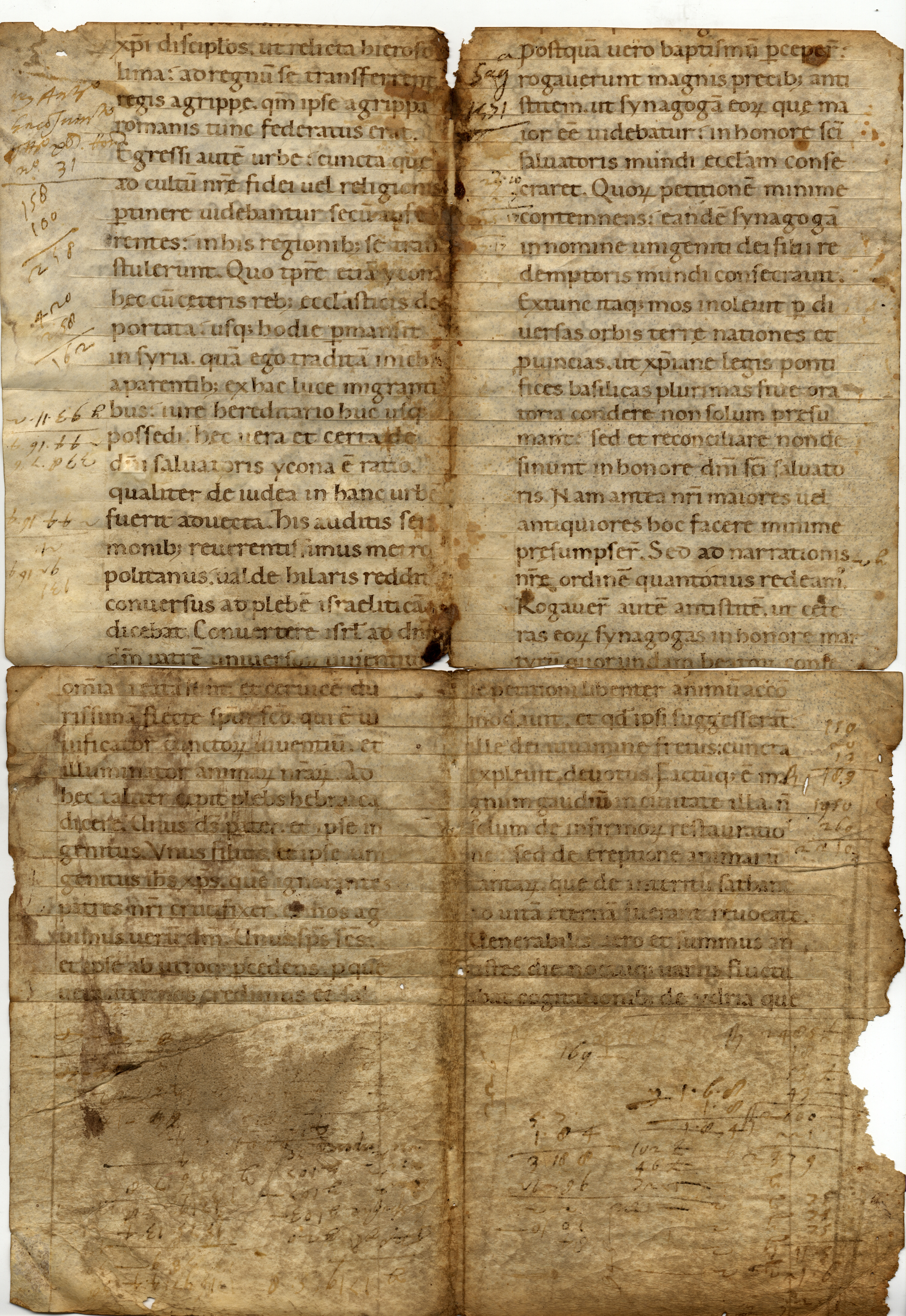 Al f. 1v (marg. sup.), di mano del sec. XVI, Sagrestia 1571 ed alcuni conti; al f. 1v (marg. inf.), della stessa mano: Capitolo ed alcuni conti. I due lacerti furono utilizzati come coperte (restano i fori per la cucitura nell’intercolumnio).