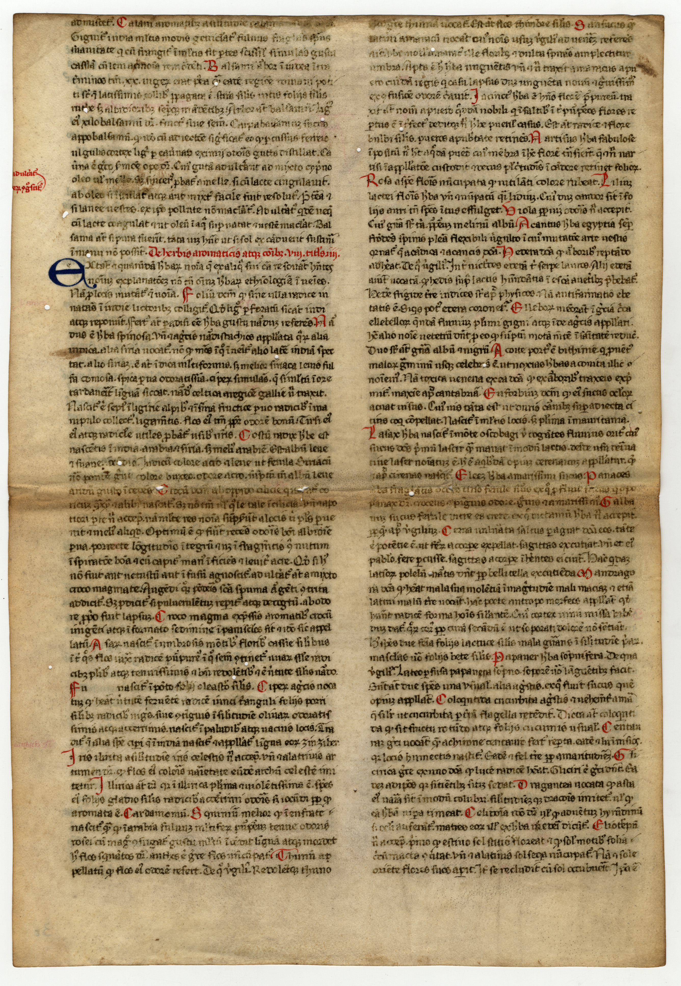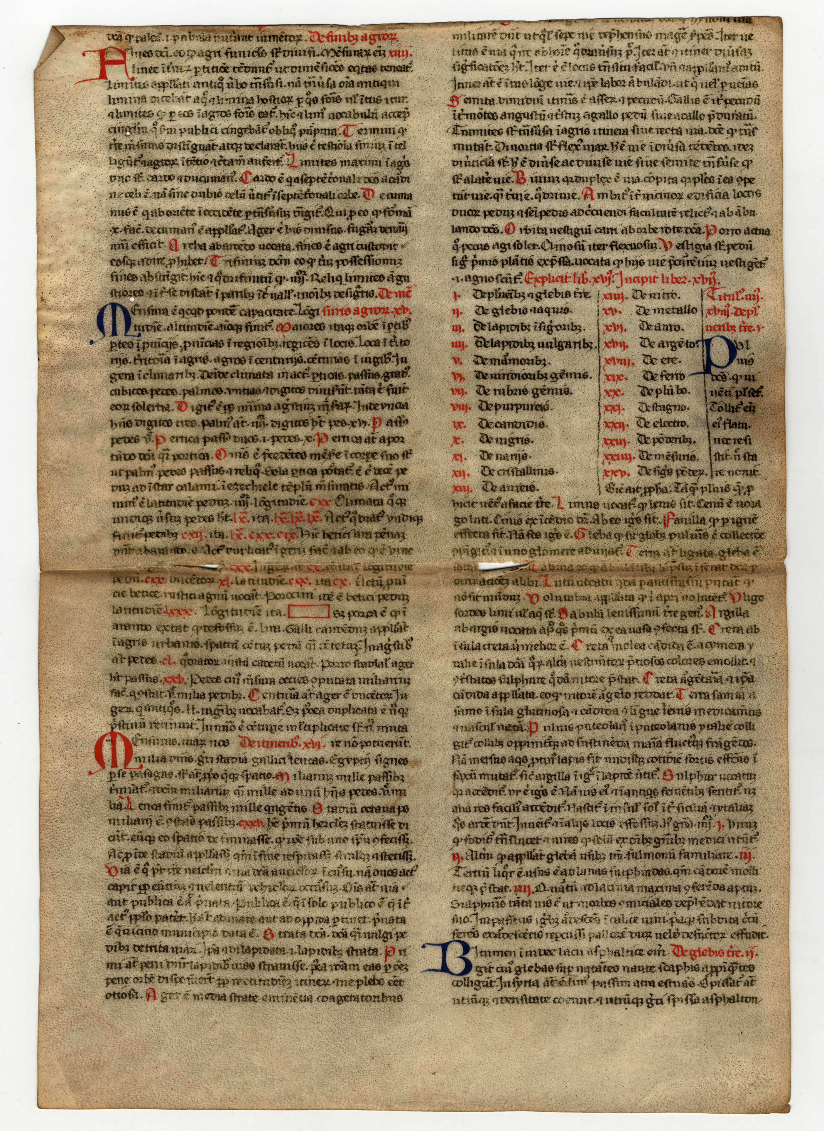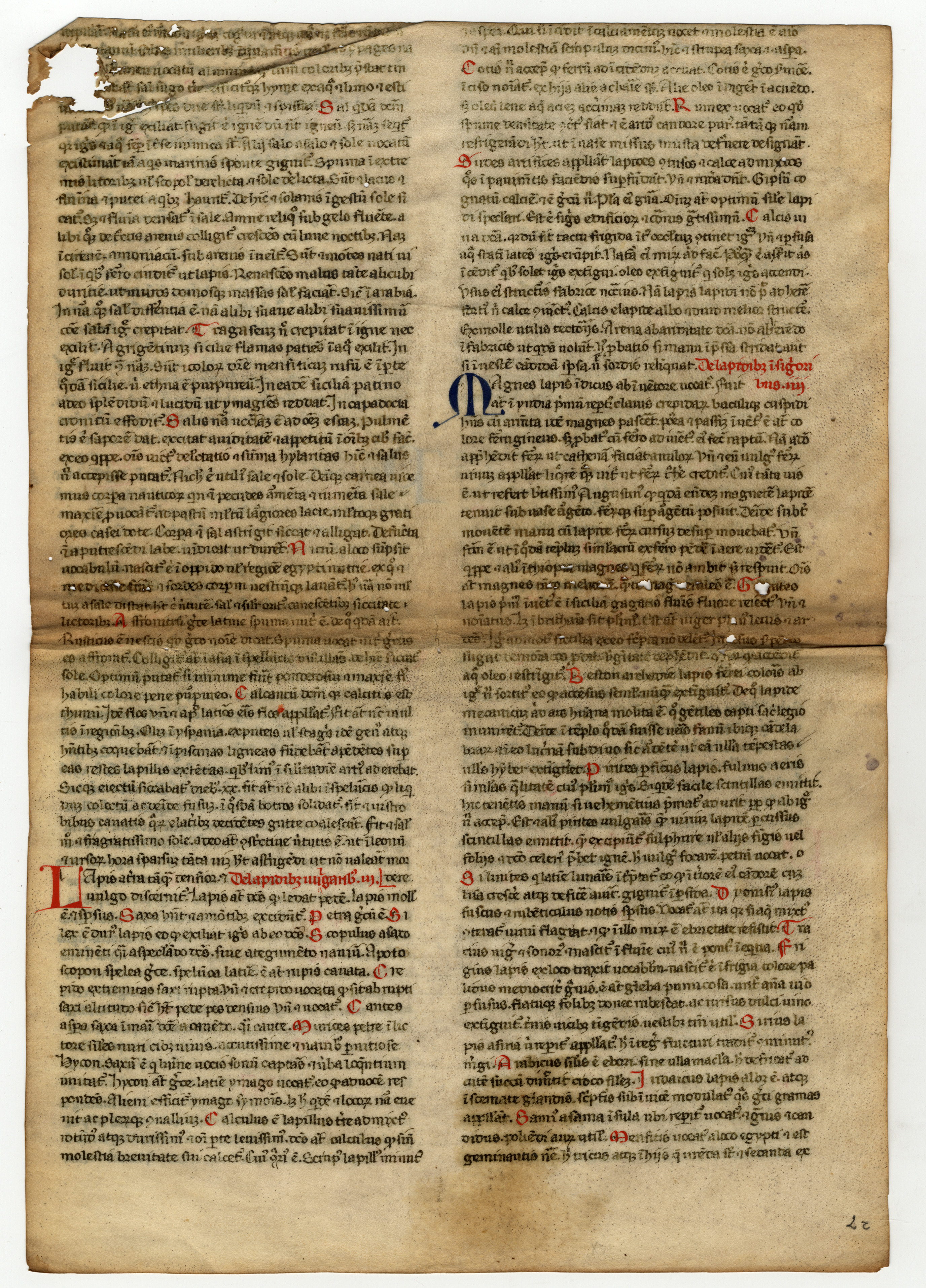 ff. 1rA-2vB, Isidoro di Siviglia, Etymologiae, libro XV, cap 8 – libro XVI, cap. 7, inc.F[seguono alcune parole evanite] semper duo sunt pares, vel a latere [; expl. Thopation ex virenti genere est omnique colore resplendens, inventa