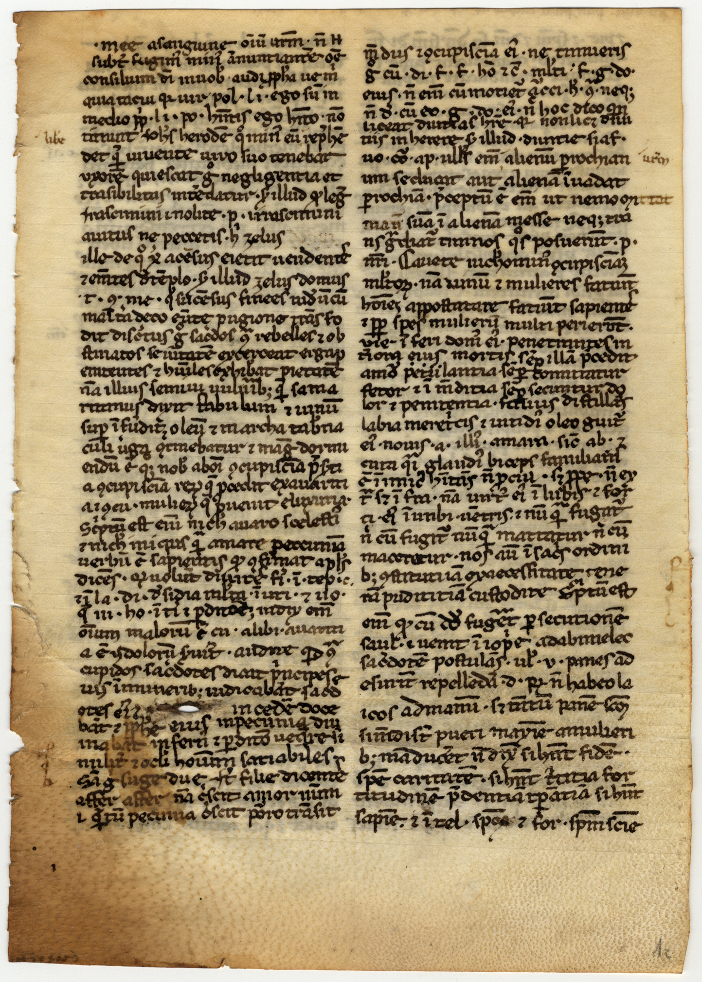 Membr.; 1 foglio; 166 × 118 = 4 [140] 22 × 12 [45 (4) 46] 11; rigatura a secco con incisione dal lato pelo; foratura visibile nel margine esterno.