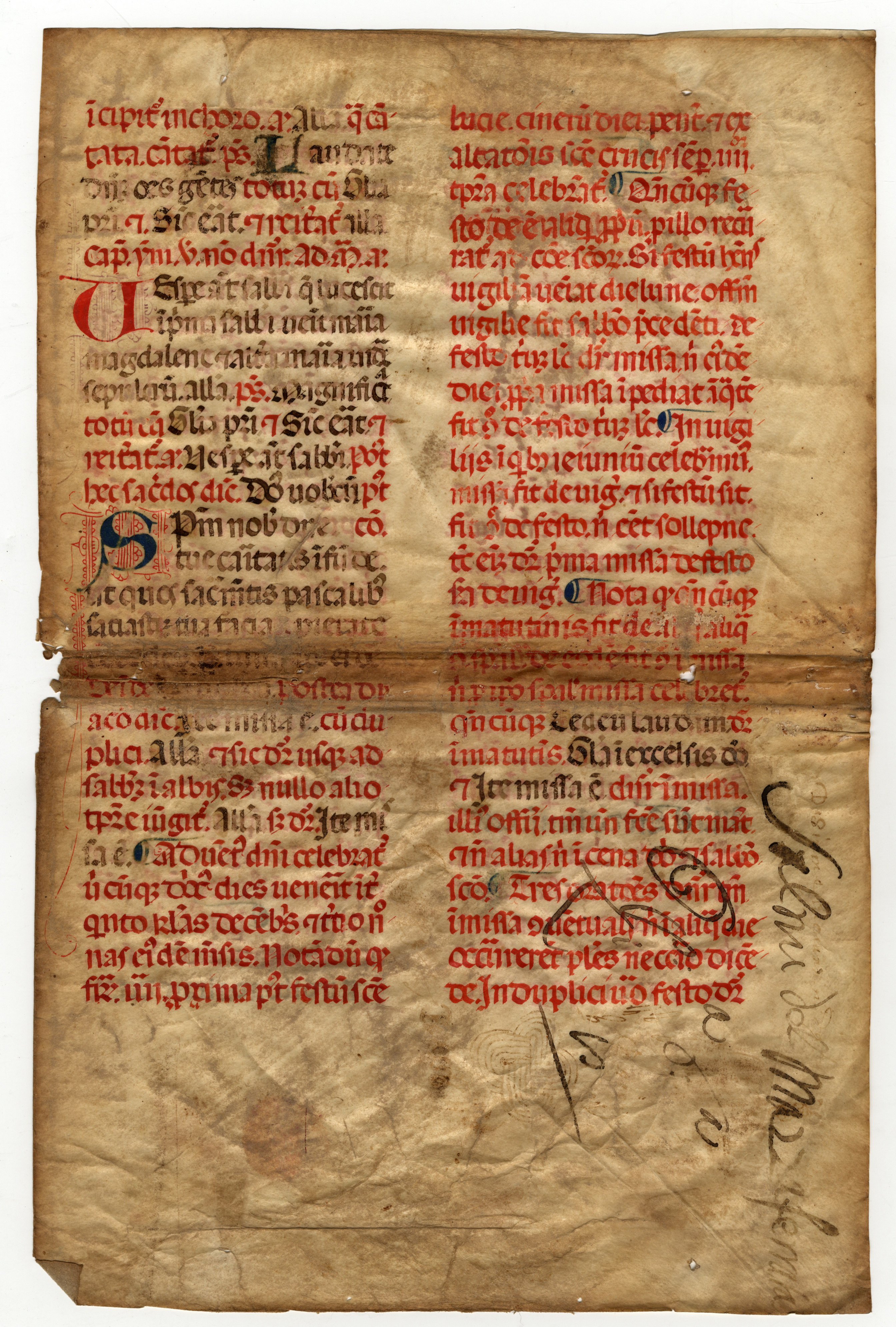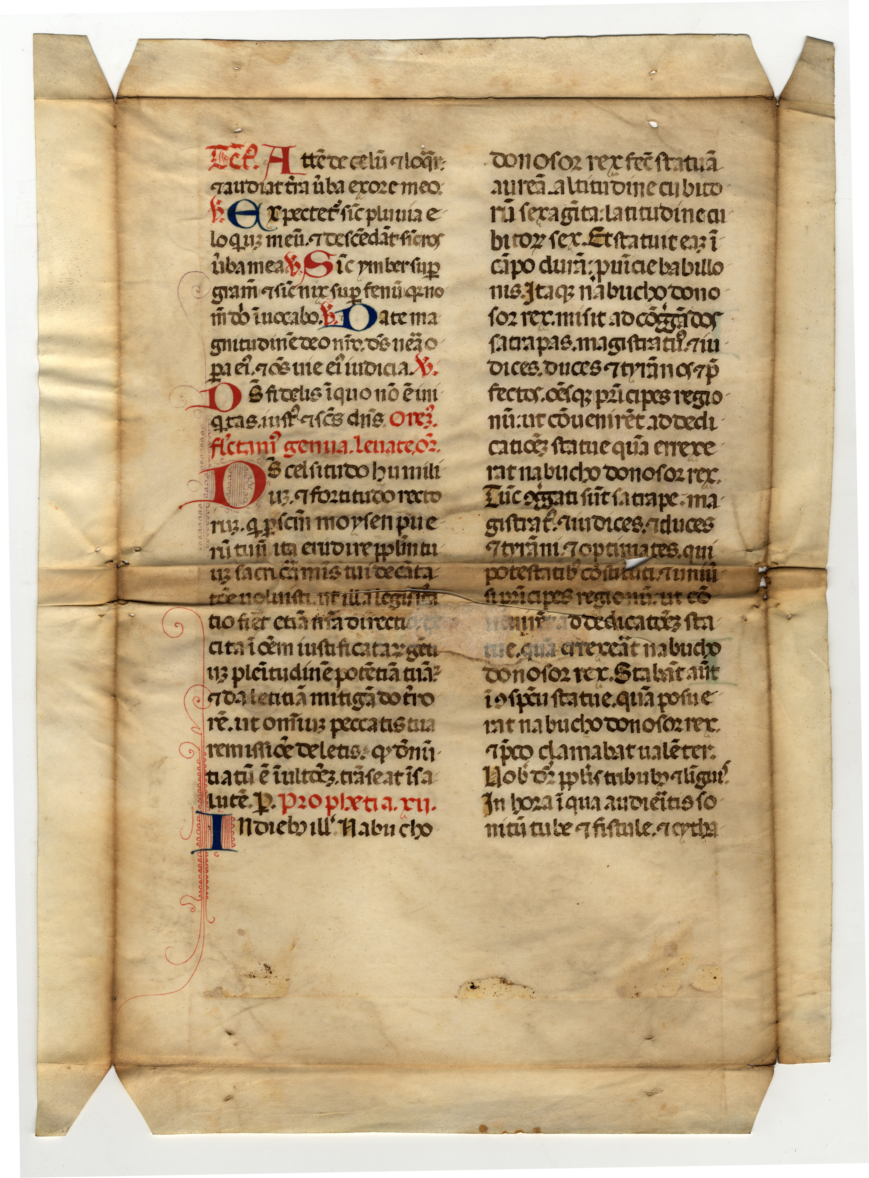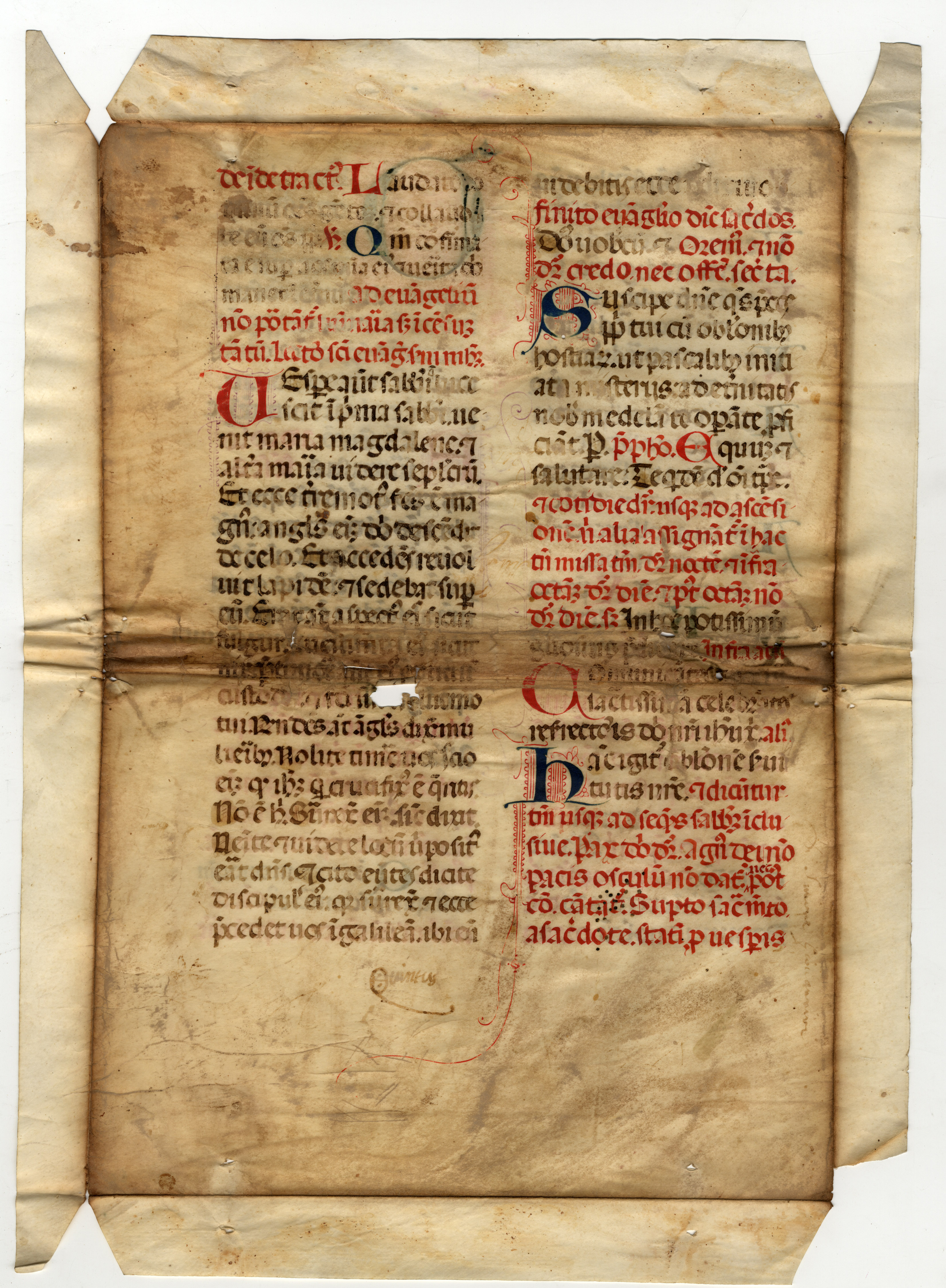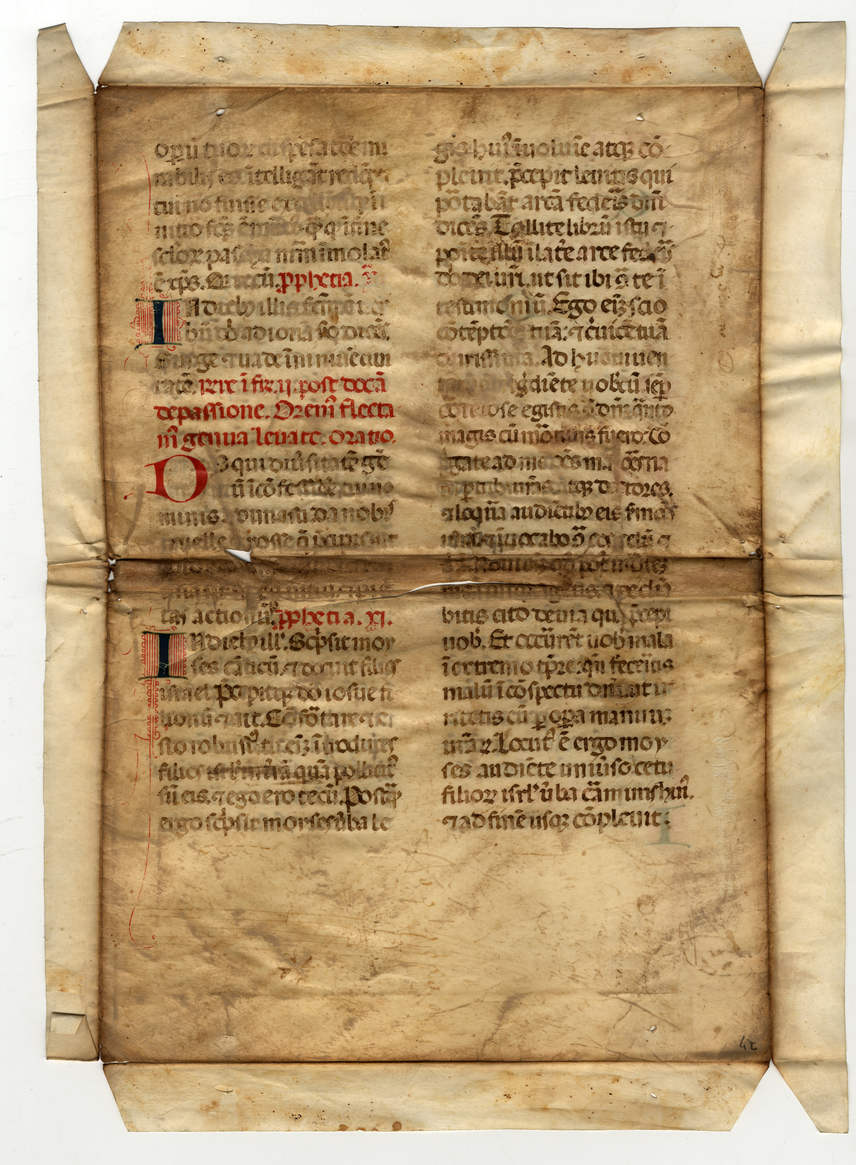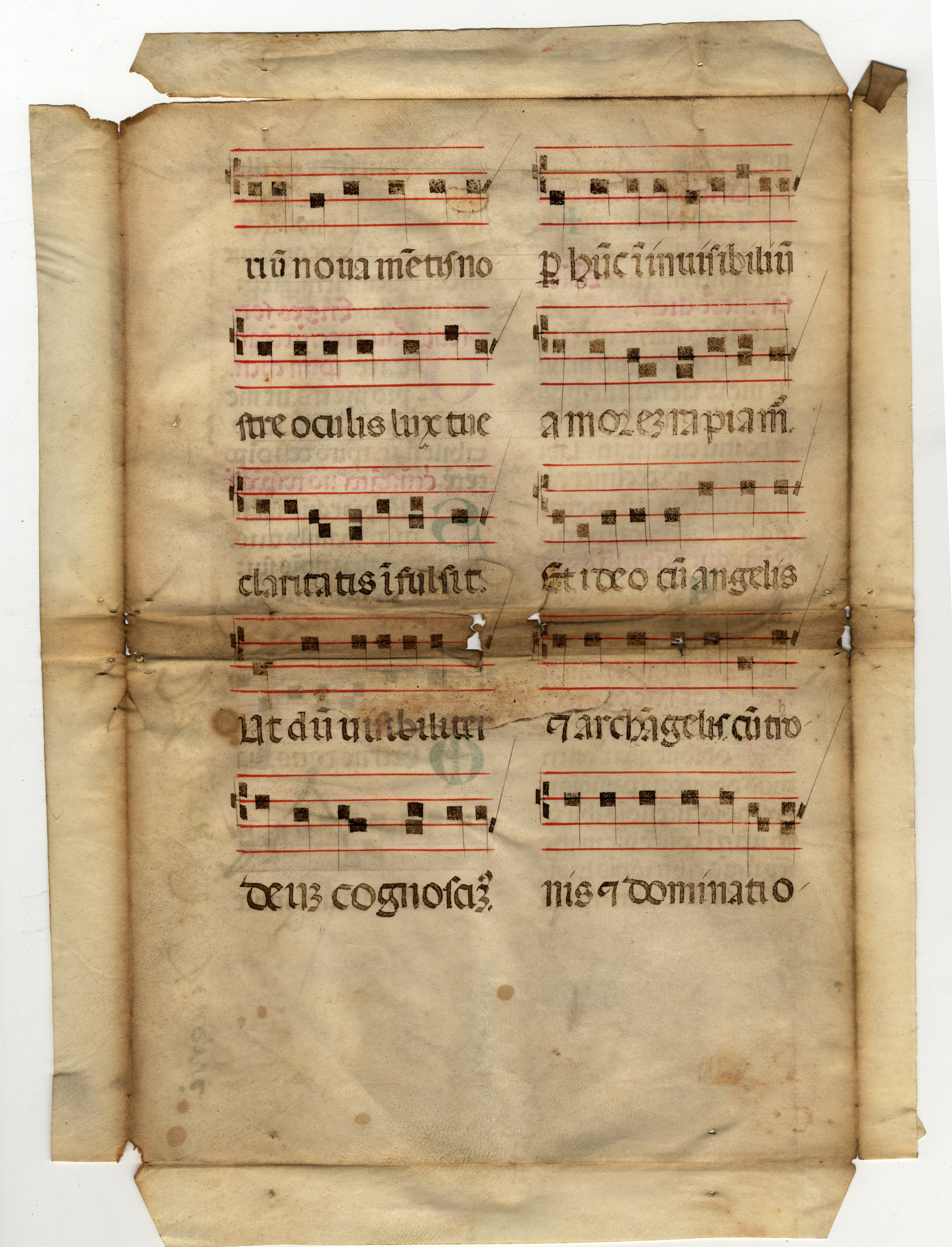 I fogli sono stati utilizzati come coperte come dimostrano i fori per la cucitura lungo il lato corto; al f. 3v di mano del sec. XVII: Salmi del Mazzaferrata.