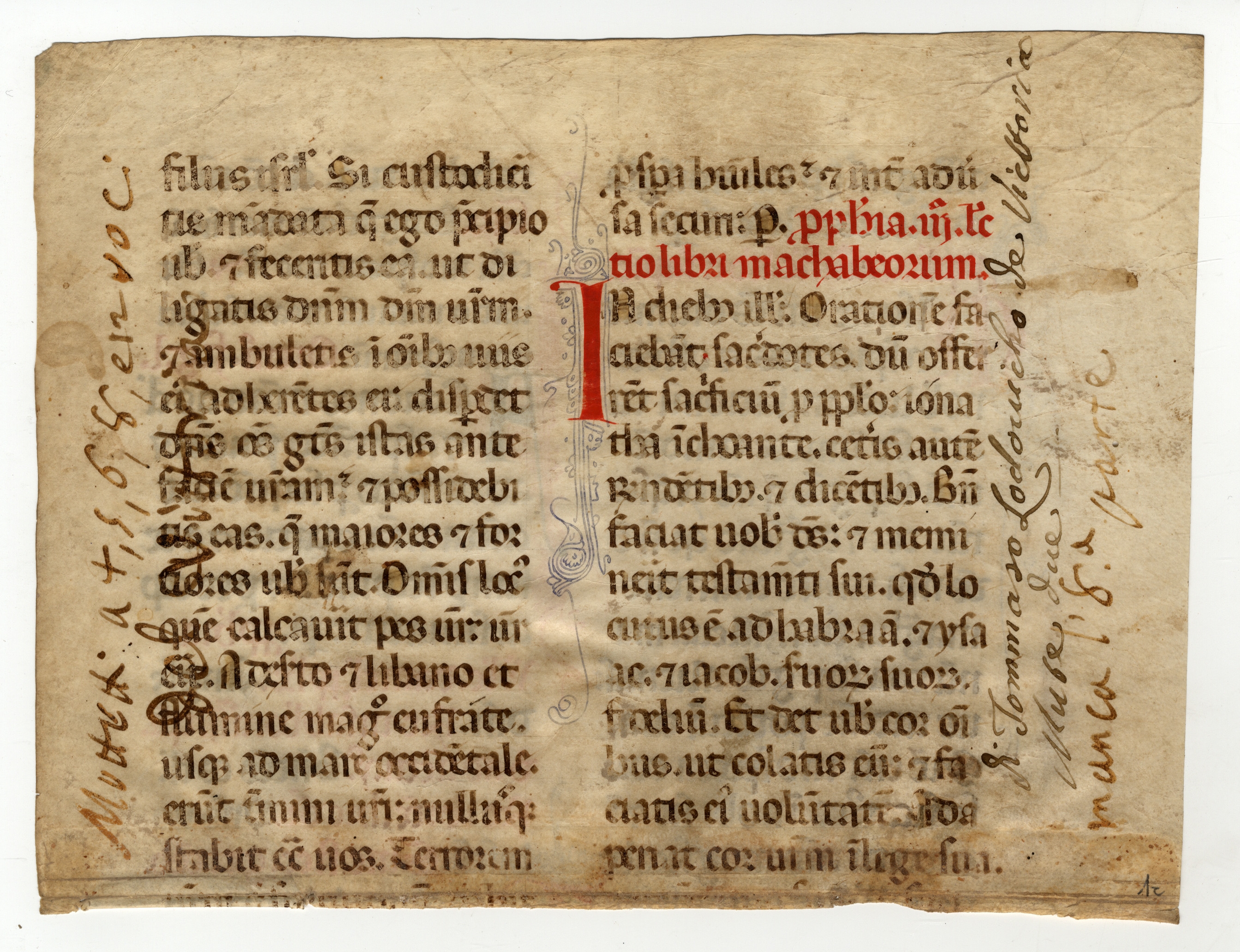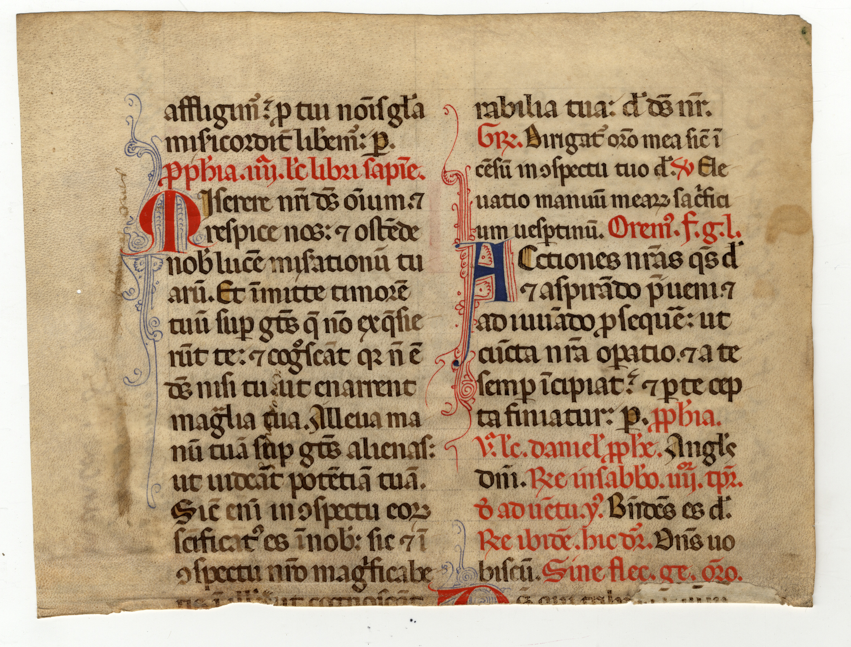 Membr.; 3 ff; il f. numerato 1 è un lacerto pari alla metà superiore del foglio; 314 ×207= 23 [225] 66 × 27 [67 (15) 67] 31, rr. 28 / ll. 27 (f. 3r); rigatura a mina di piombo. Iniziali filigranate alternativamente in rosso e blu; maiuscole toccate di giallo; rubriche.