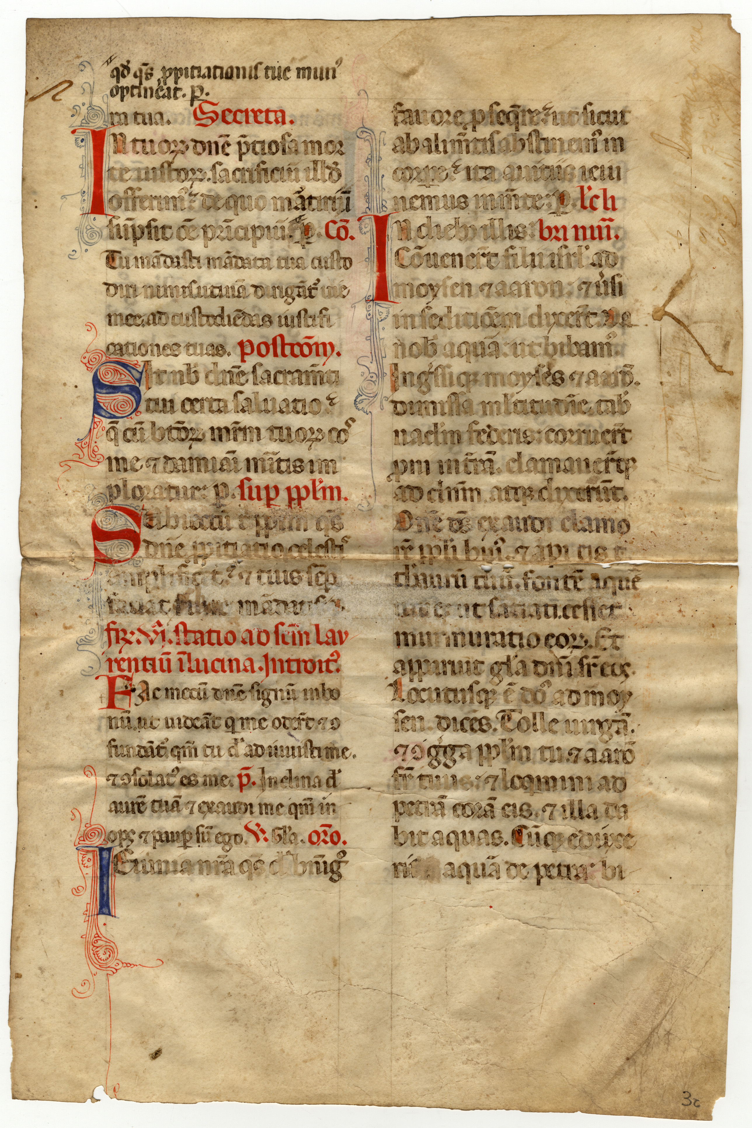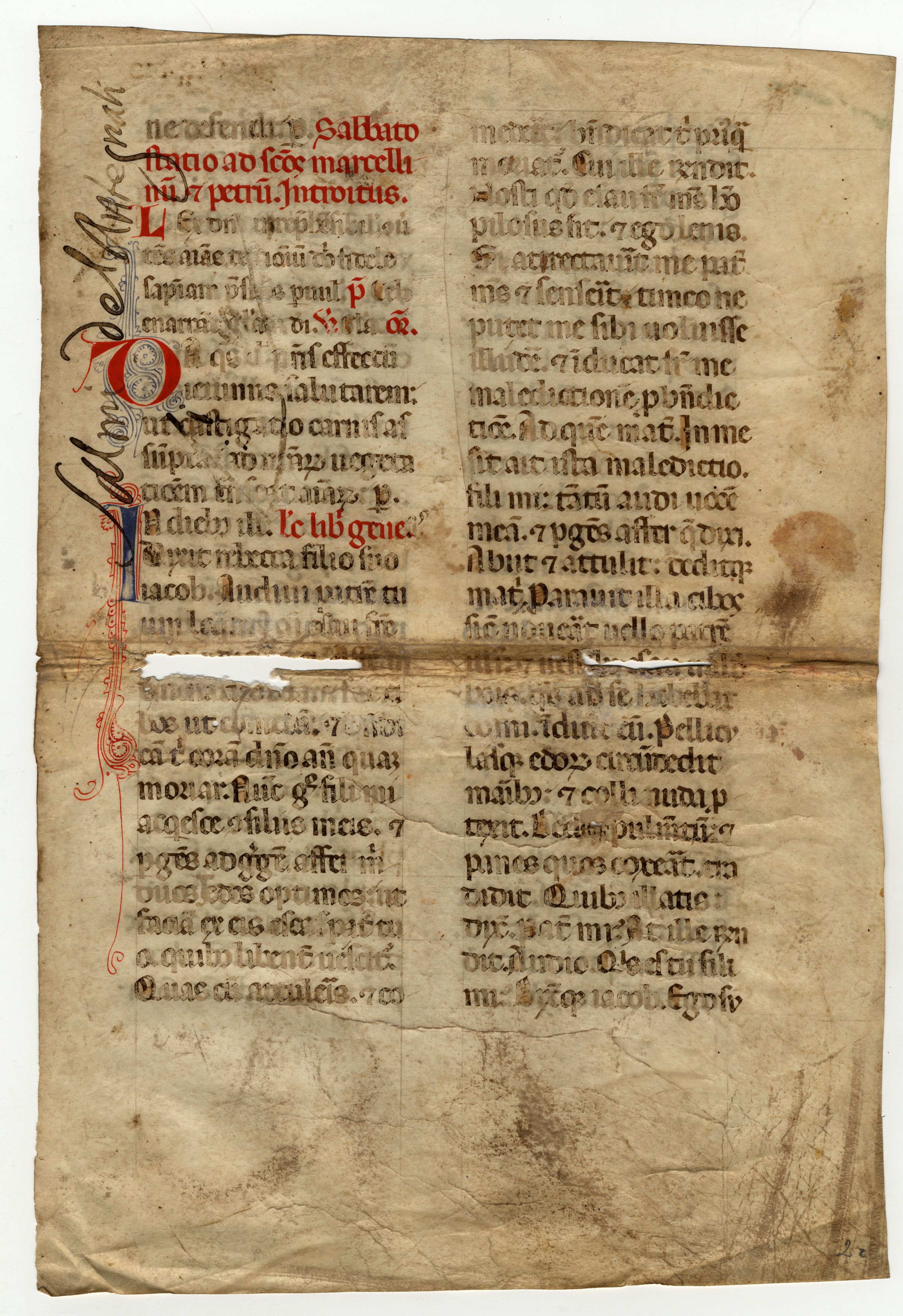 f. 2rA-vB Messale, Sabbato post Dominicam II Quadragesimae inc. –ne defendi. Sabbato statio ad sanctos Marcellinum et Petrum. Introitus. Lex Domini irreprehensibilis; expl. de venatione cibos patri intulit dicens: Sur-