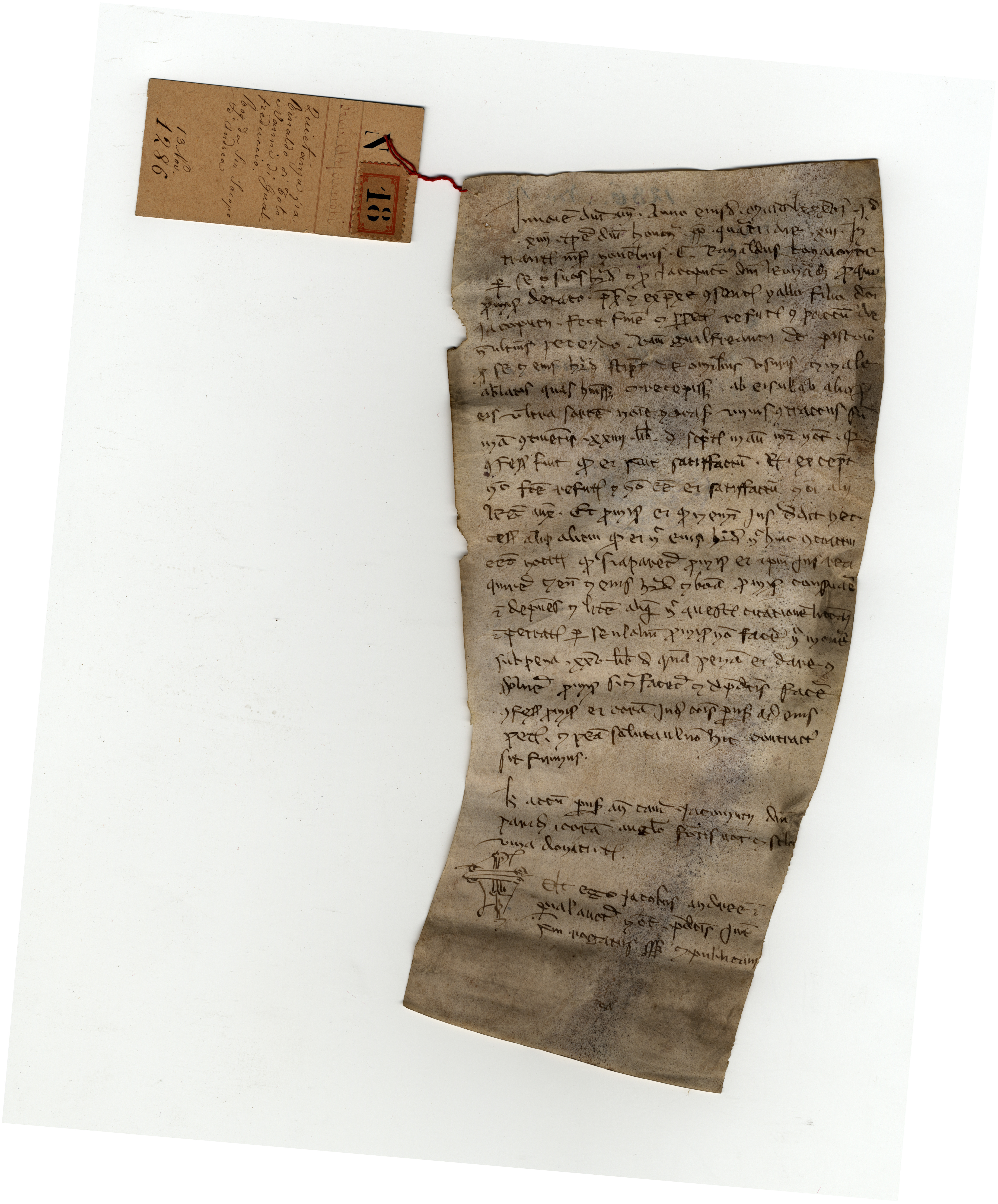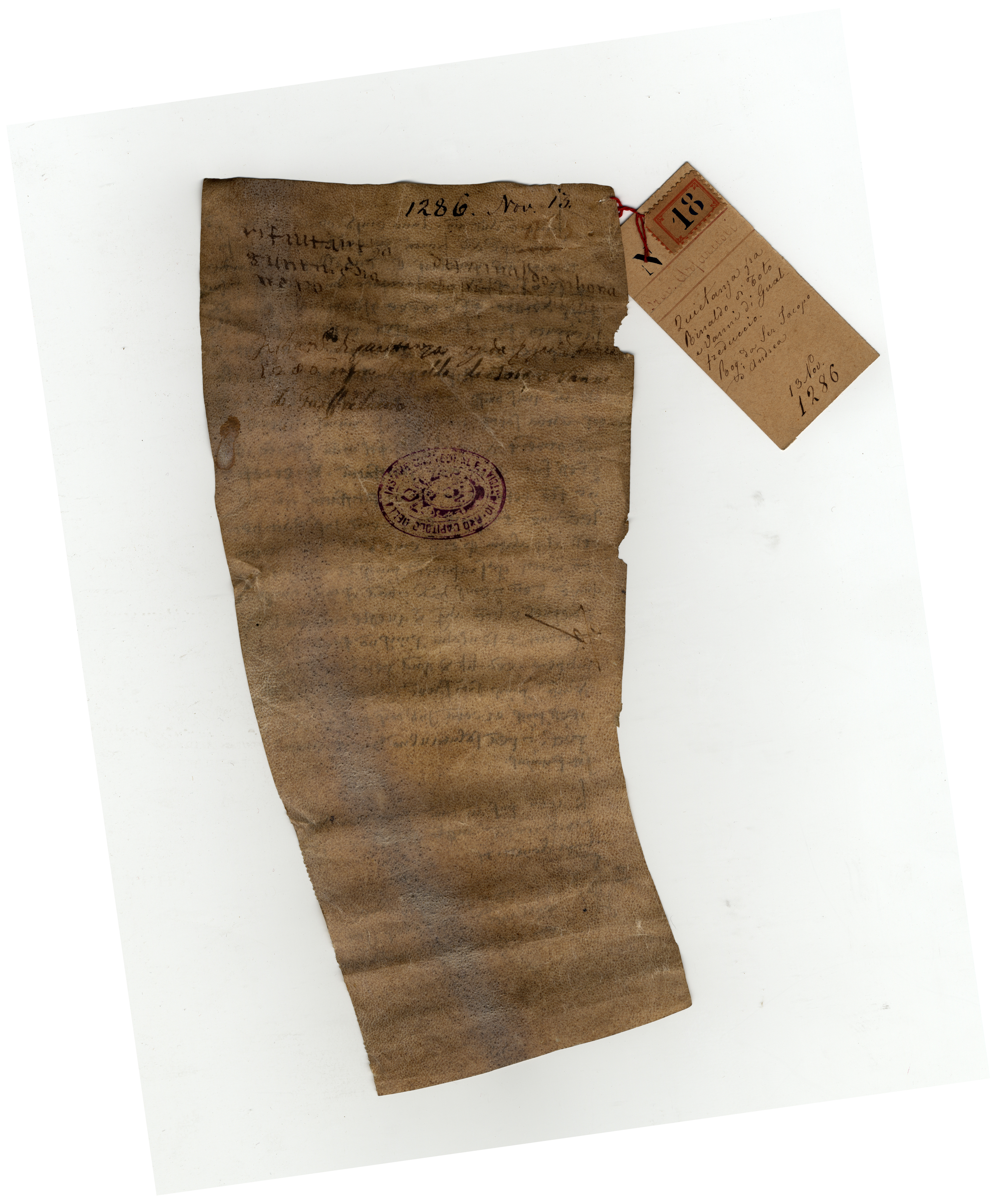 Originale: Archivio Capitolare di Pistoia, Pergamene, n. 18 [A]. Nel margine inferiore, di mano coeva (forse dello stesso notaio) con inchiostro più chiaro: «Va(nni)». Sul verso, mano sec. XIII: «Rifiutantha – di Rainaldo di Bona|gunta ed Ia-chopucio da Monte|nero» (la stringa, disposta su due righe, è attraversata da uno spazio bianco, indicato con il trattino: la nota dorsale è stata evidentemente apposta sulla pergamena già arrotolata e fermata con una cordicella); mano sec. XVII: «n. 5»; mano sec. XVIII: «Instrumento di quietanza rogato da ser Iacopo d’Andrea, | 1286, inter Rinaldo di Toto e Vanni | di Gualfreduccio»; mano sec. XIX: «1286 nov. 13»; timbro dell’archivio. Alla pergamena è legato un cartellino: «N. 18. Prov. Arfaruoli. Quietanza fra Rinaldo di Toto e Vanni di Gualfreduccio. Rog. da ser Iacopo d’Andrea. 13 nov. 1286».