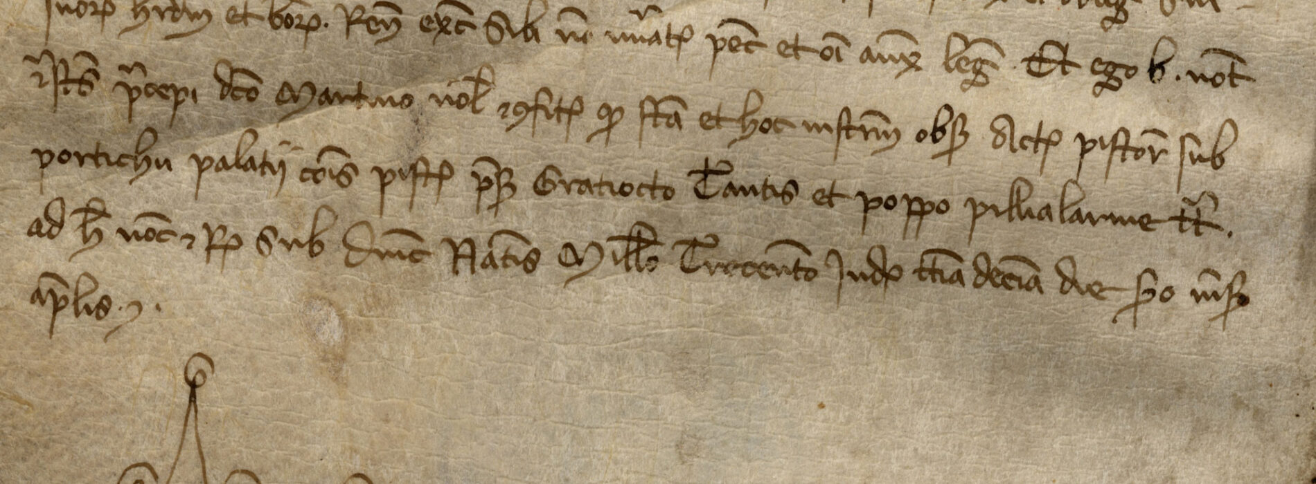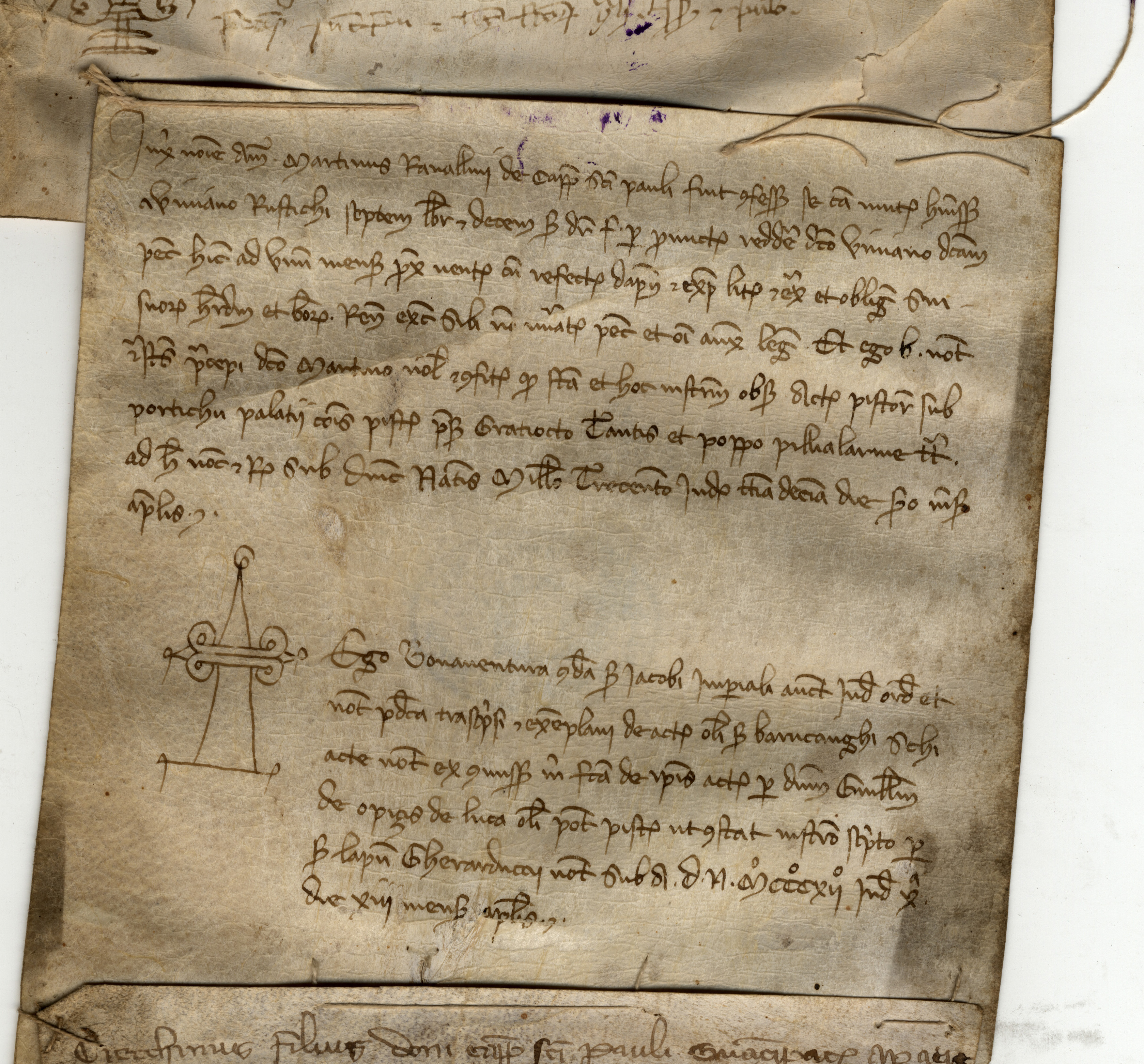 Pergamena mm 157×144: un taglio, cucito, si apre dal margine inferiore.