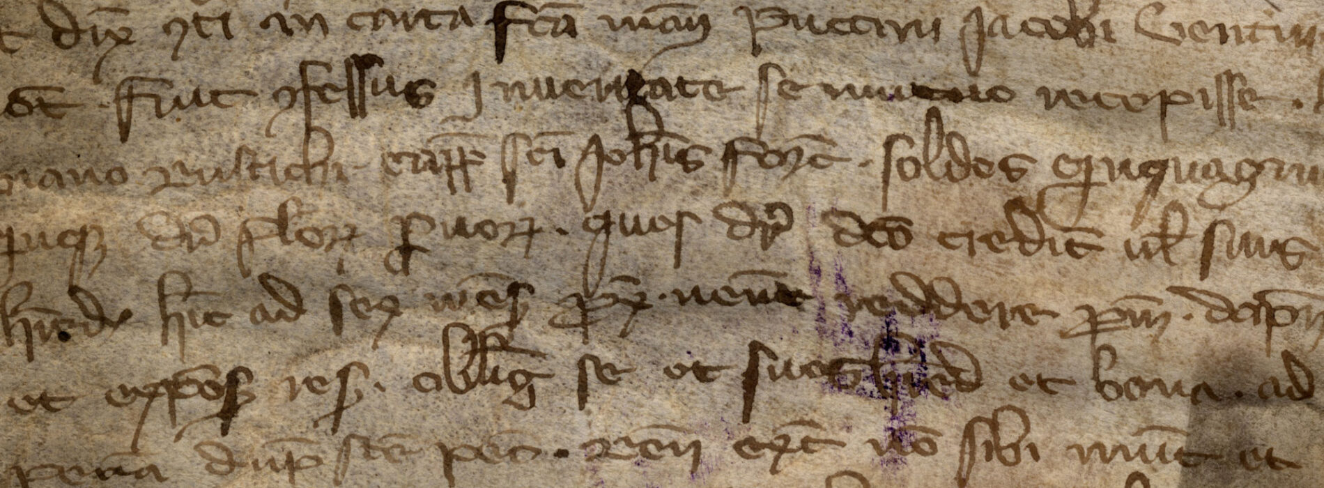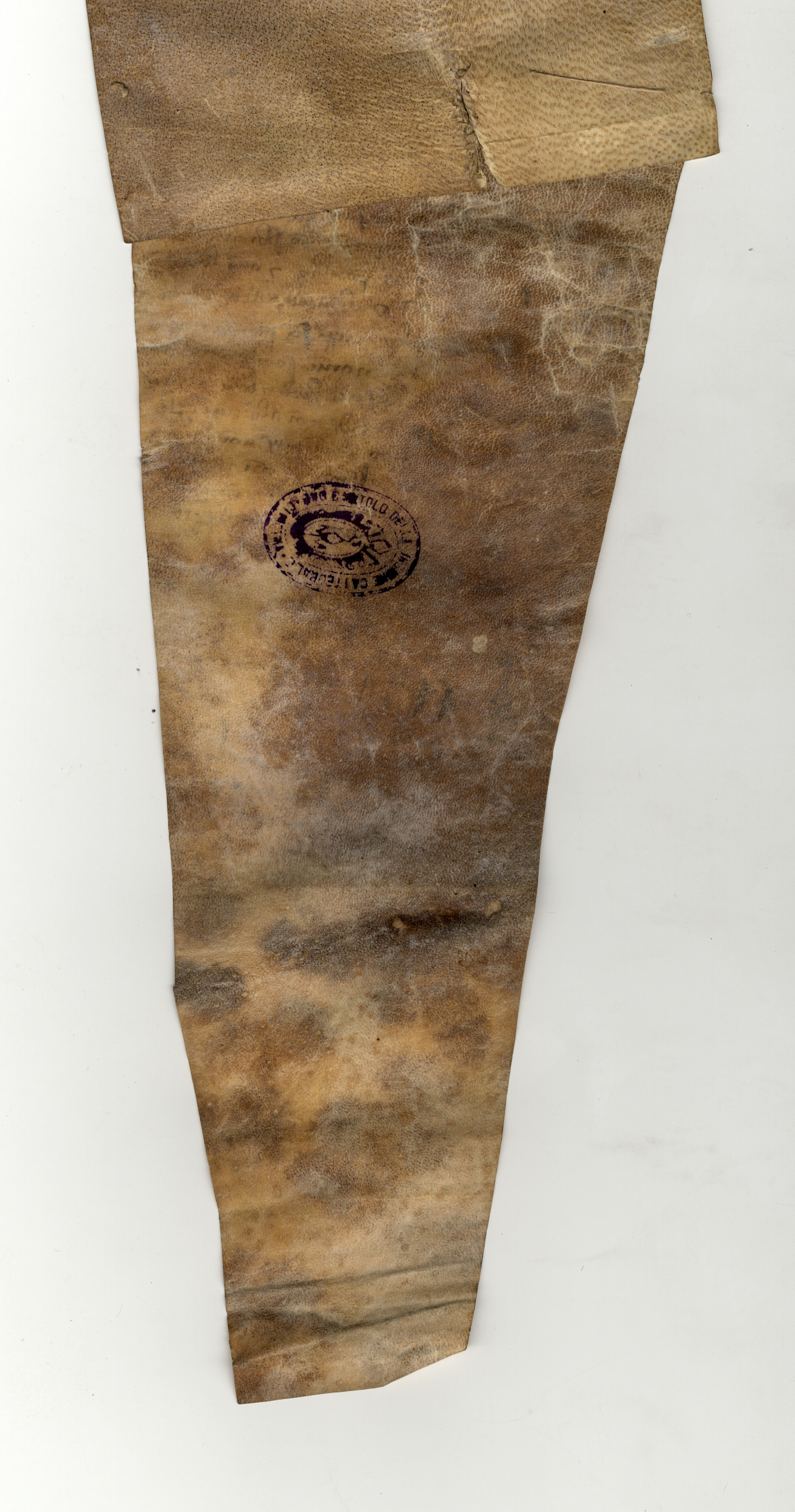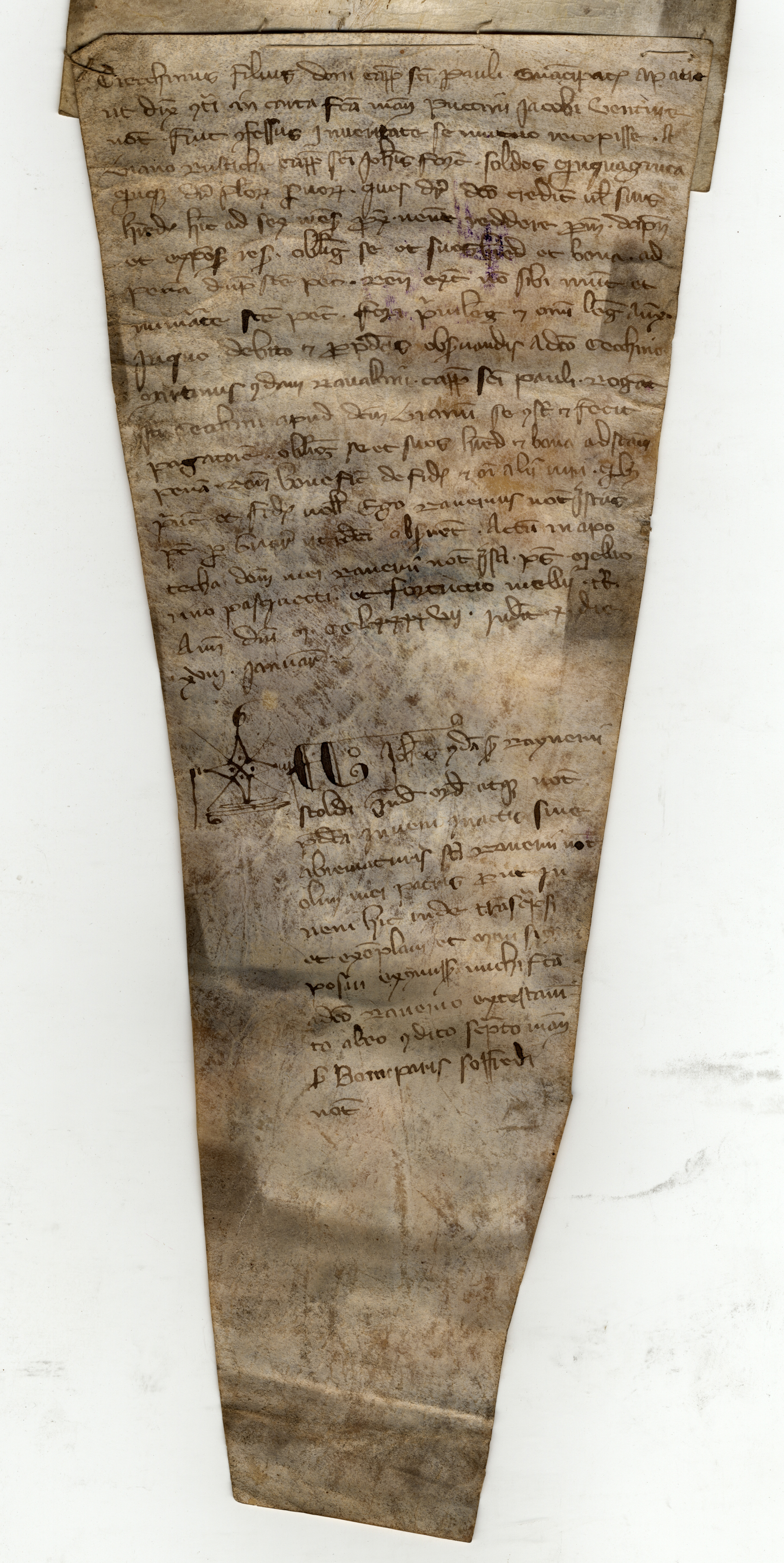 Pergamena, di forma trapezoidale, mm 325×149/55: scurita e macchiata.