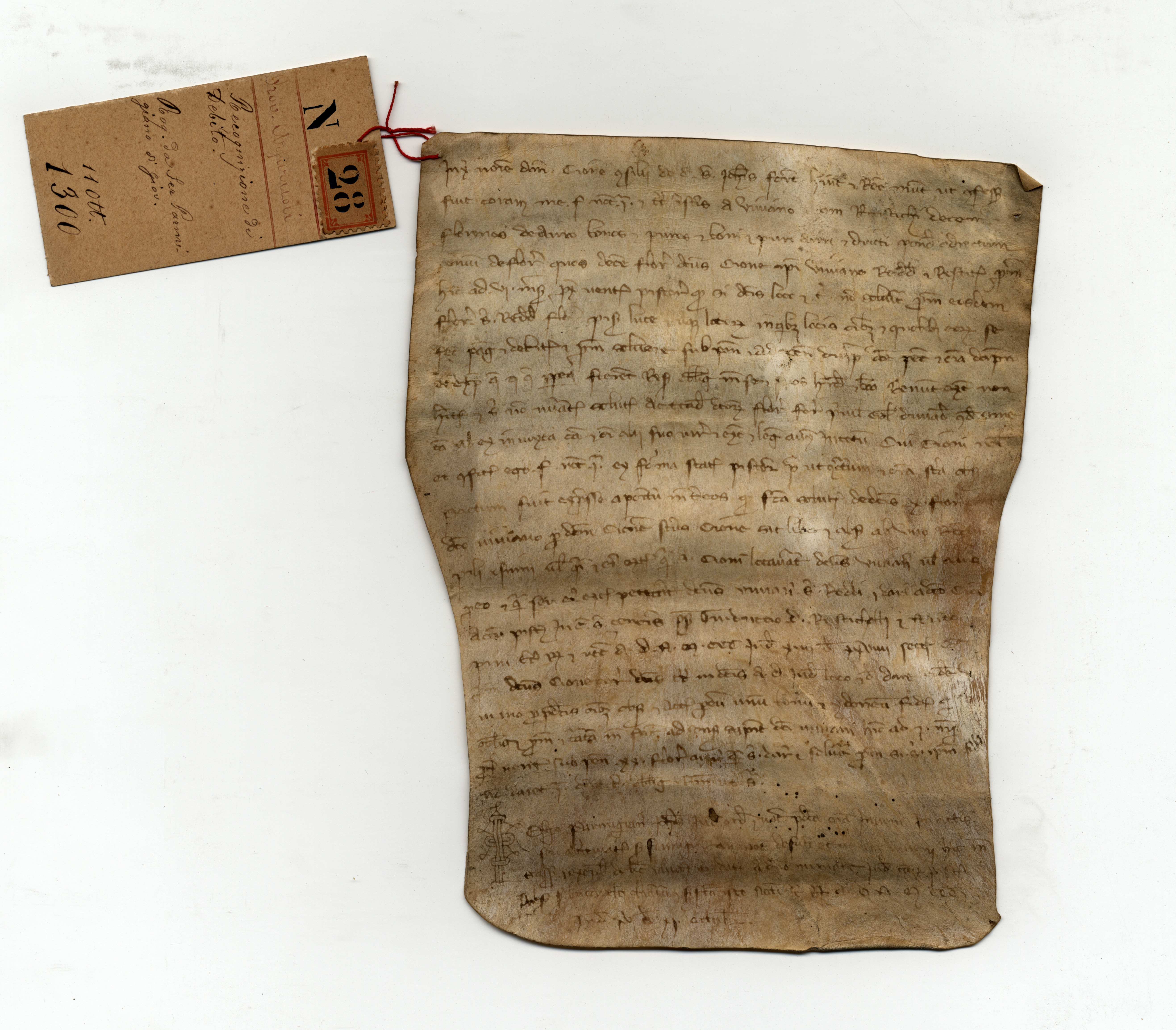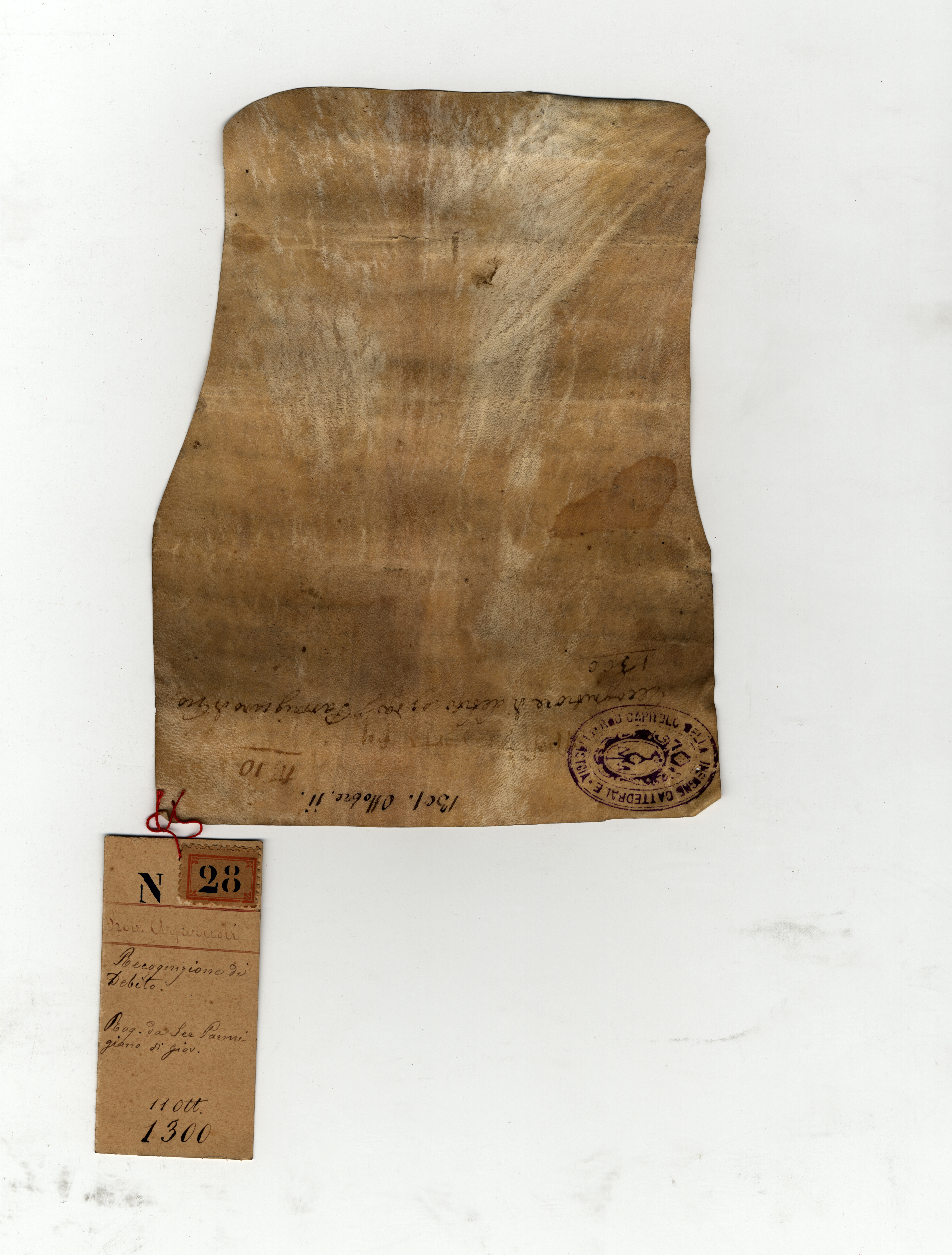 Copia autentica di imbreviatura: Archivio Capitolare di Pistoia, Pergamene, n. 28 [B]. Sul verso, mano sec. XVII: «n. 10»; mano sec. XVIII: «Recognitione di debito rogata da ser Parmigiano di Giovanni. | 1300»; mano sec. XIX: «1301 ottobre 11»; timbro dell’archivio. Alla pergamena è legato un cartellino: «N. 28. Prov. Arfaruoli. Recognizione di debito. Rog. da ser Parmigiano di Giov. 11 ott. 1300».
