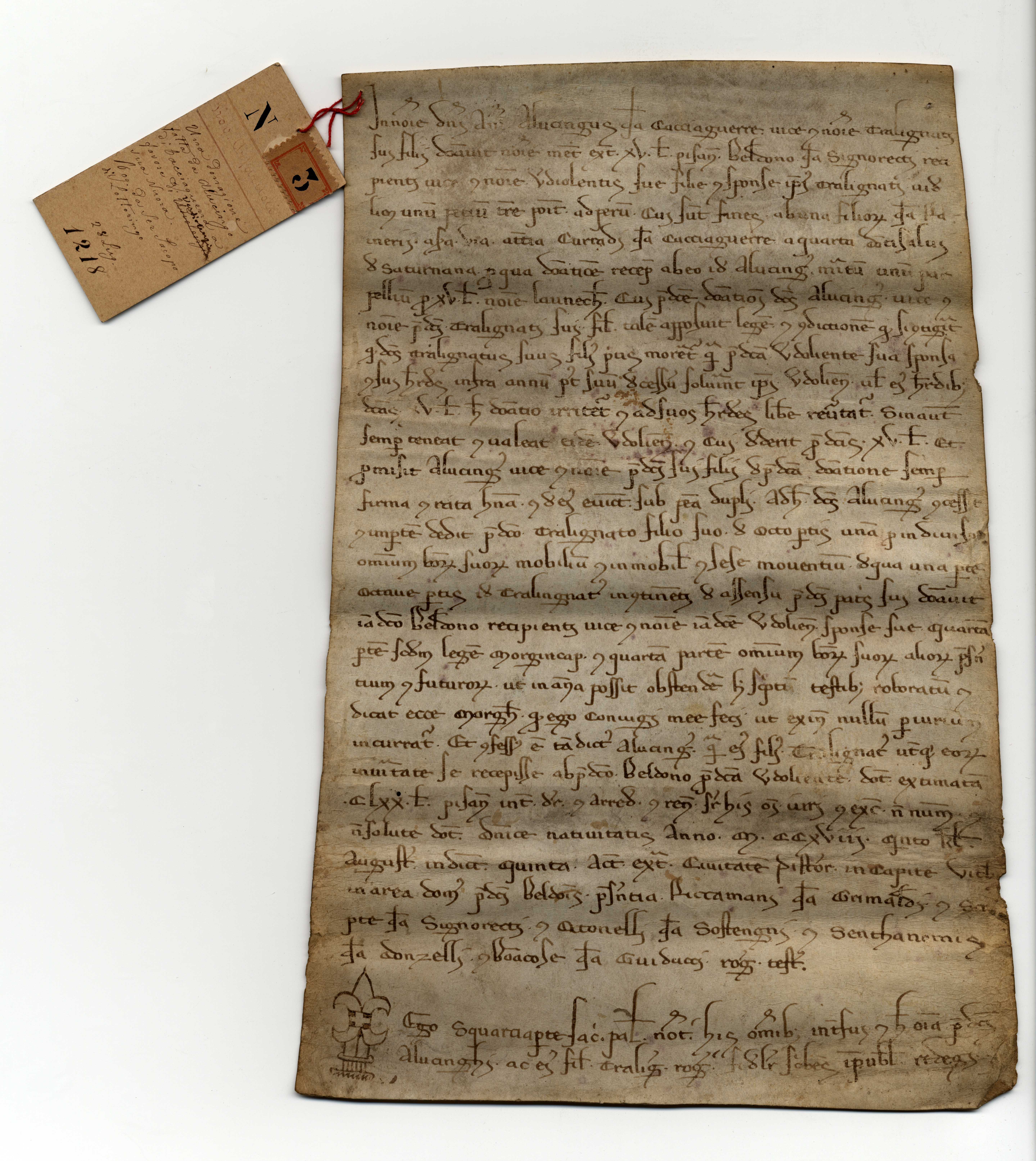 Alucingus del fu Cacciaguerra, a nome del figlio Tralignato, dona a Beldono del fu Signoretto, padre di Verdiolente, sposa del figlio Tralignato, un terreno a Pero del valore di 15 lire di denari pisani, a titolo di meta, ricevendo in cambio un paio di pelli di pari valore, come launegild; Alucingus dona, quindi, al figlio l’ottava parte del proprio patrimonio, di cui Tralignato consegna la quarta parte a Beldono come morgengabe. Contestualmente, Alucingus e Tralignato ricevono da Beldono la dote di Verdiolente, del valore di 170 lire di denari pisani.