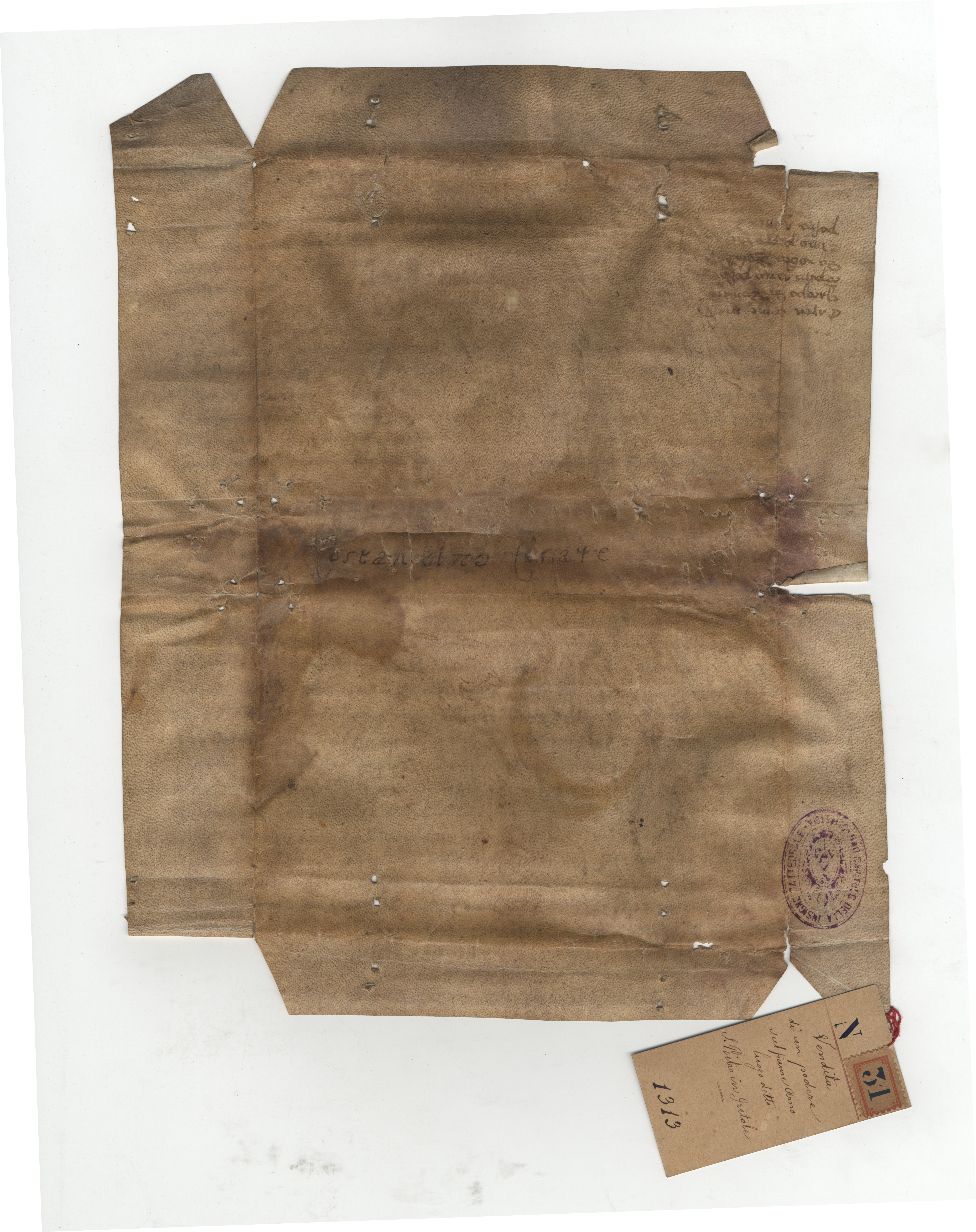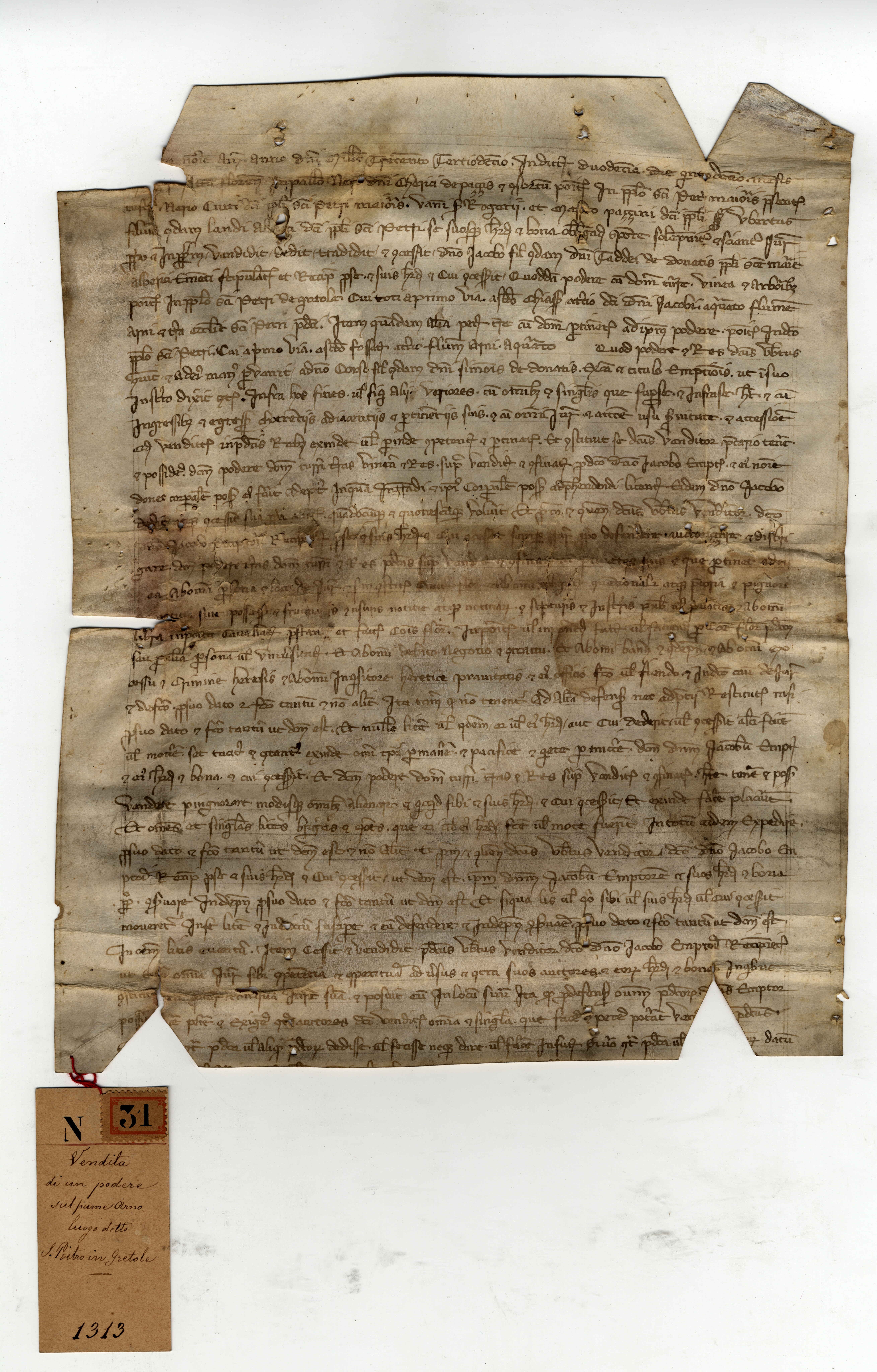 Originale: Archivio Capitolare di Pistoia, Pergamene, n. 31 [A]. Sul verso, di mano del notaio: «Carta come messer | Iacopo de’ Donati | comperò uno podere | da Uberto degl’Albiçi | e uno peçço di terra | posto a Quintole»; mano sec. XVI: «Costantino Cessare»; timbro dell’archivio. Alla pergamena è legato un cartellino: «N. 31. Vendita di un podere sul fiume Arno, luogo detto S. Pietro in Gretole. 1313».