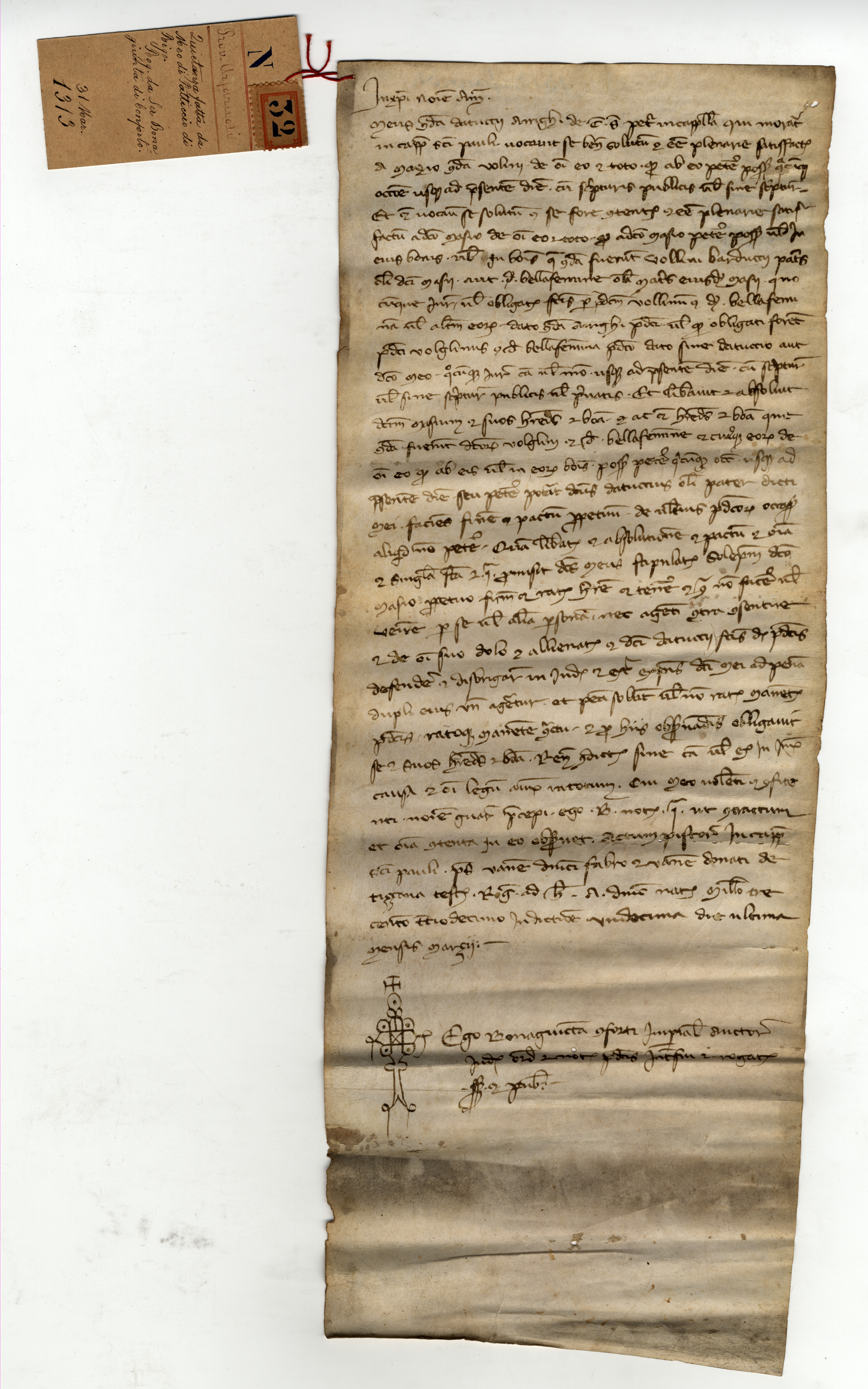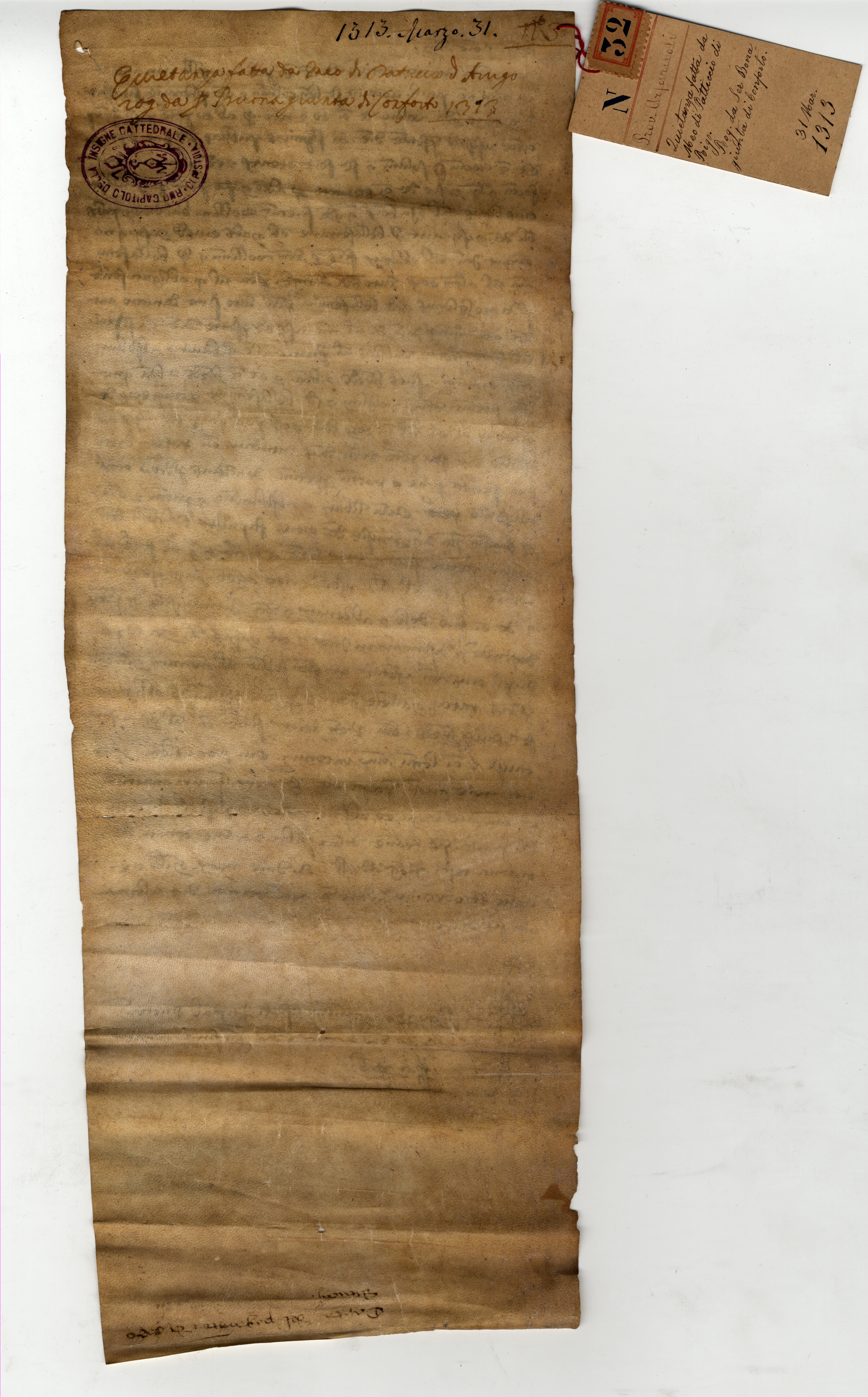 Originale: Archivio Capitolare di Pistoia, Pergamene, n. 32 [A]. Sul verso, mano sec. XIV: «Carta del pagamento di Meo | Datuccii»; mano sec. XVII: «n. 3»; mano sec. XVIII: «Quietanza fatta da Meo di Datuccio d’Arrigo | rogata da ser Buonagiunta di Conforto. 1313»; mano sec. XIX: «1313 marzo 31»; timbro dell’archivio. Alla pergamena è legato un cartellino: «N. 32. Prov. Arfaruoli. Quietanza fatta da Meo di Patticcio di Rigo. Rog. da ser Bonagiunta di Conforto. 31 marzo 1313».