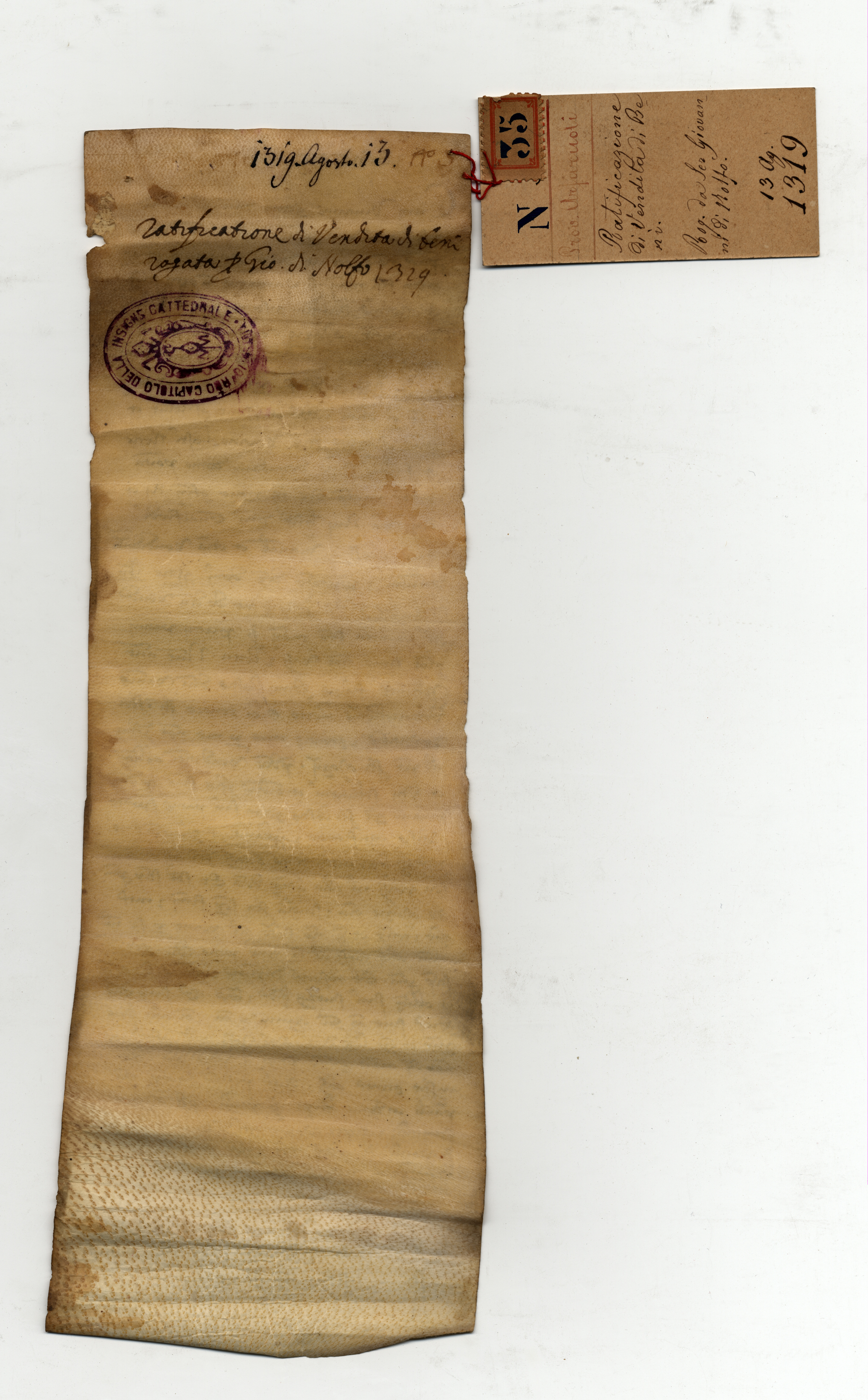 Originale: Archivio Capitolare di Pistoia, Pergamene, n. 35 [A]. Sul verso, mano sec. XIV: «Magio […]»; mano sec. XVII: «n. 5»; mano sec. XVIII: «Ratificatione di vendita di beni | rogata per Giovanni di Nolfo. | 1319 »; mano sec. XIX: «1319 agosto 13»; timbro dell’archivio. Alla pergamena è legato un cartellino: «N. 35. Prov. Arfaruoli. Ratificazione di vendita di beni. Rog. da ser Giovanni di Nolfo. 13 agosto 1319».