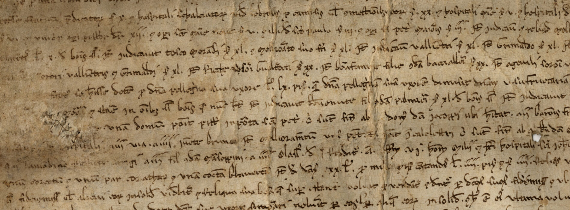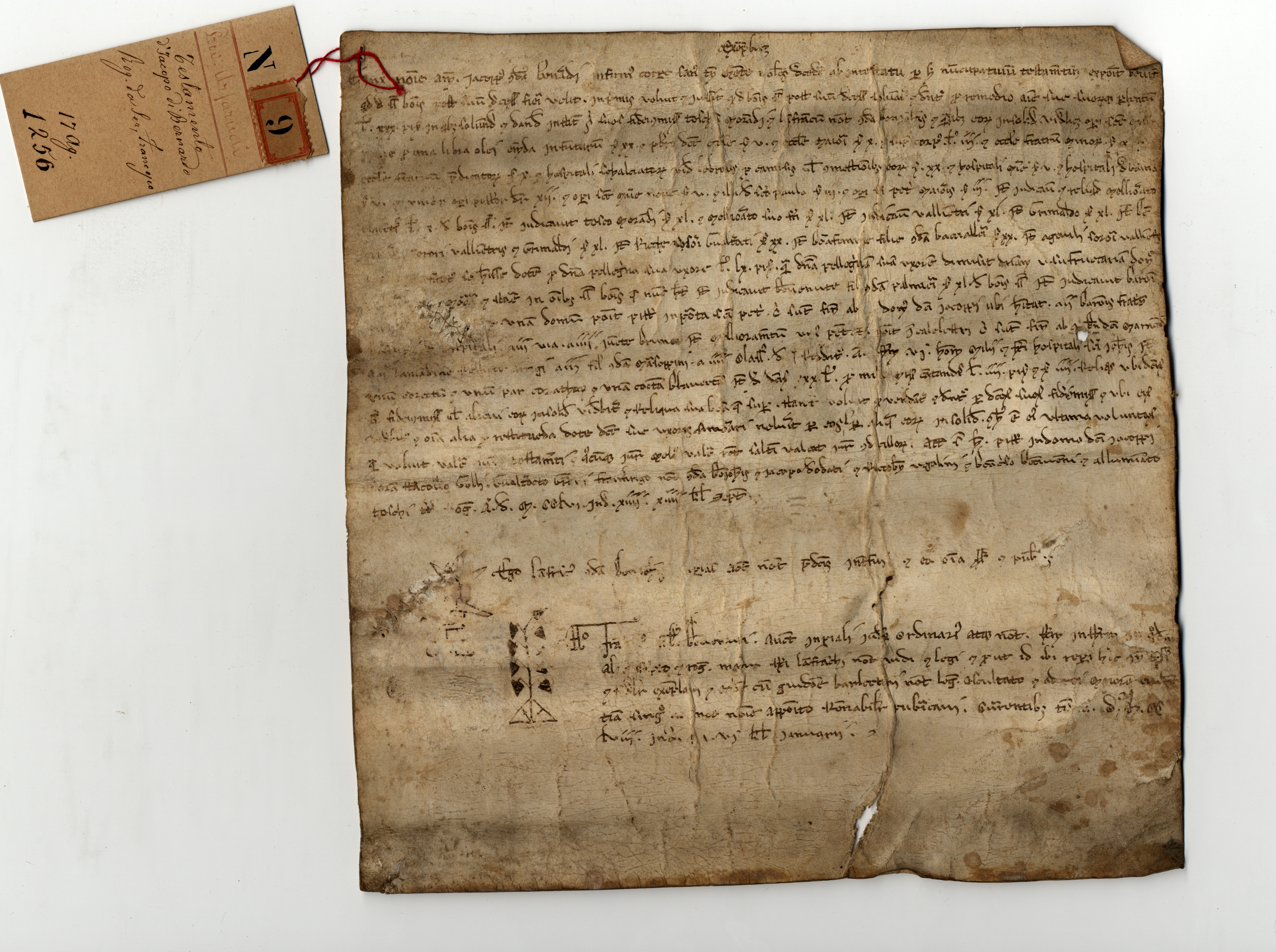 Pergamena mm 225×214: macchie e inchiostro caduto in molti punti; due fori e due tagli cuciti nel margine sinistro.