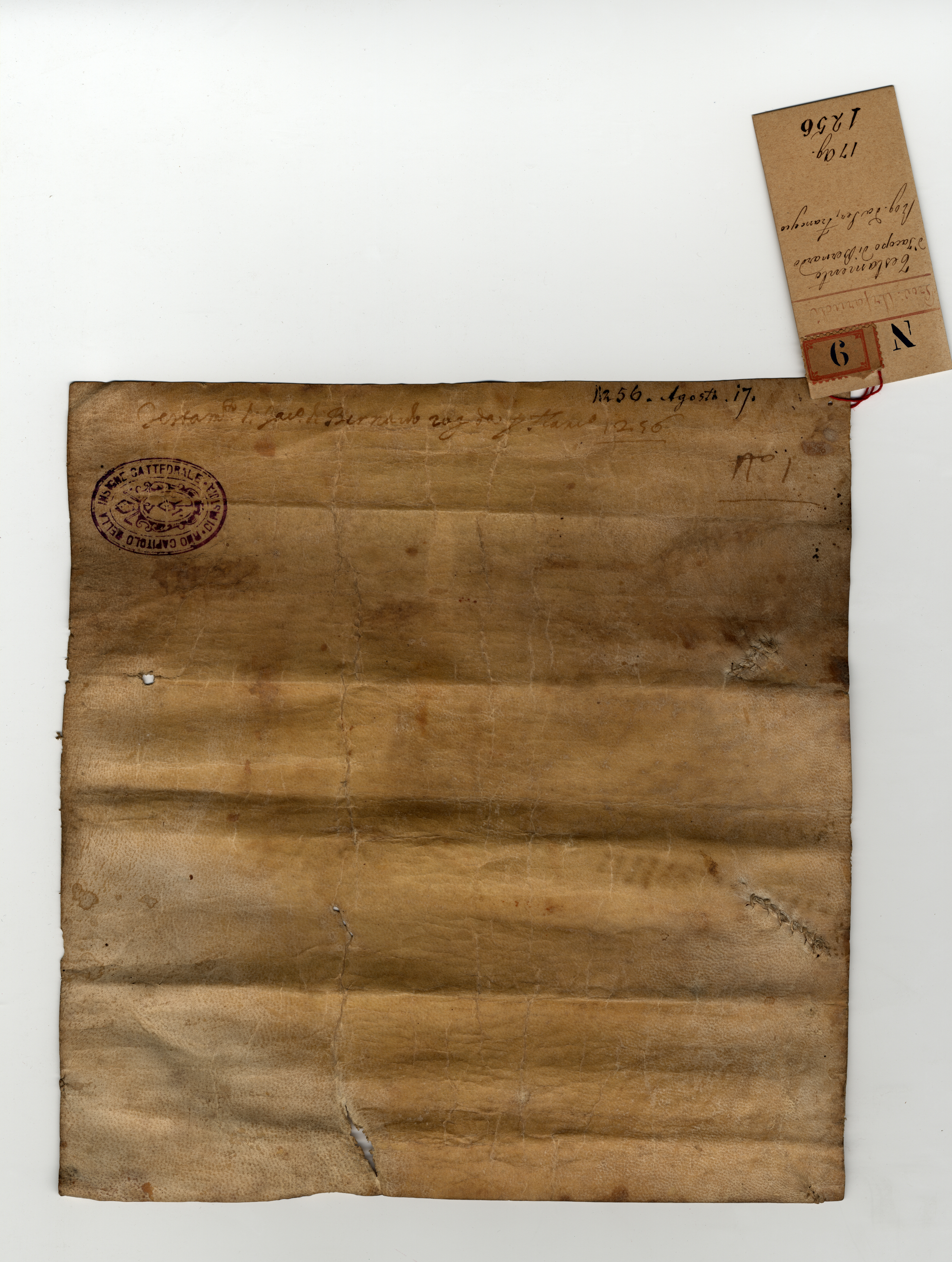 Copia autentica del 1258 dicembre 27: Archivio Capitolare di Pistoia, Pergamene, n. 9 [B]. Sul verso, mano sec. XVII: «n. 1»; mano sec. XVIII: «Testamento di Iacopo di Bernardo rogato da ser Francesco. 1256»; mano sec. XIX: «1256 agosto 17». Alla pergamena è legato un cartellino: «N. 9. Prov. Arfaruoli. Testamento d’Iacopo di Bernardo. Rog. da ser Francesco. 17 ag. 1256».